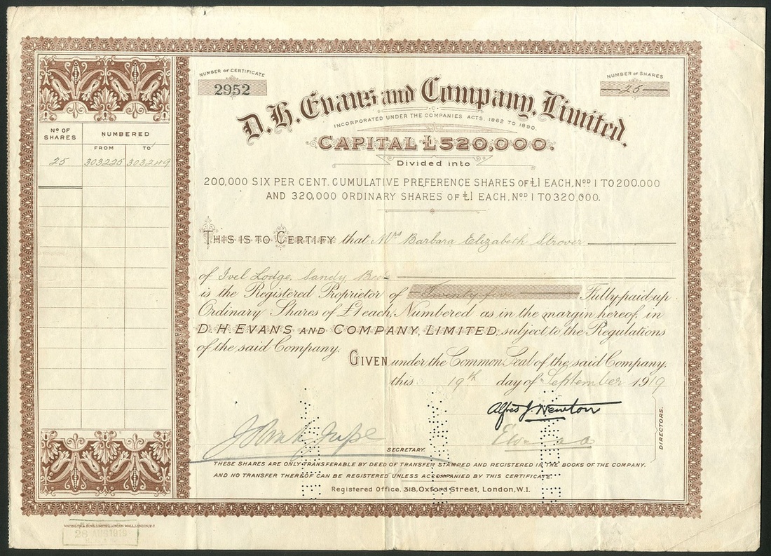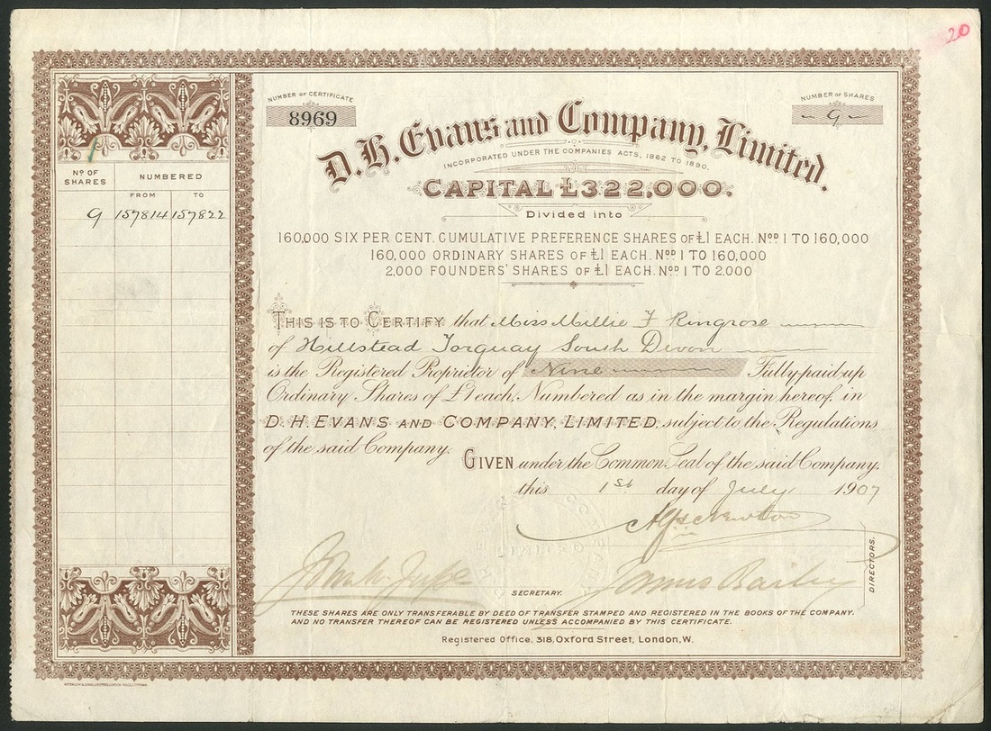 Great Britain: D. H. Evans and Co. Ltd., a pair of certificates for ordinary shares of £1 each, the first dated 19[07], #8969, capital £322,000, the latter dated 19[19], #2952, capital £520,000, both printed by Waterlow, ornate borders, brown. Company formed in 1893 to acquire the drapery store in London and moved to new premises in Oxford Street. Merged with Harrods in 1928 but continued to trade in its own name and run as a whiolly owned subsidiary of Harrods. Purchased by House of Fraser in 1954 and rebranded in 2001 under the House of Fraser name and D.H.Evans disappeared. Creasing and minor edge nicks, VF (2).