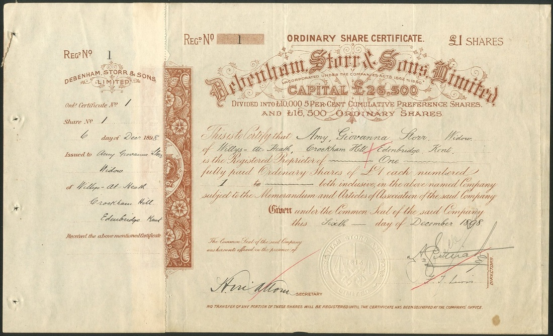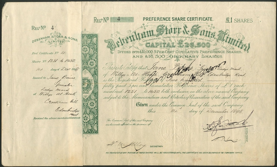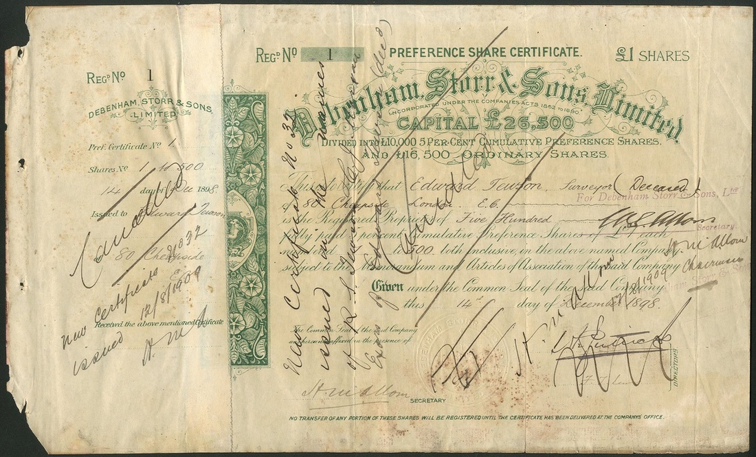 Great Britain: Debenham, Storr & Sons Ltd., a trio of certificates, £1 preference shares, [1898], #1, green, 'cancelled' across face, this piece a little tatty, together with another of the same, #4, in better condition, and £1 ordinary shares, [1898], #1, brown. Auctioneers and Estate Agents in Covent Garden, London who built a large new building in 1860. Merged with Coe & Sons of Old Brompton Road to form Debenham Coe around 1970 and their South Kensington Galleries were acquired by Christies to form the very successful Christies South Kensington Saleroom. The first only F, other 2 VF (3).