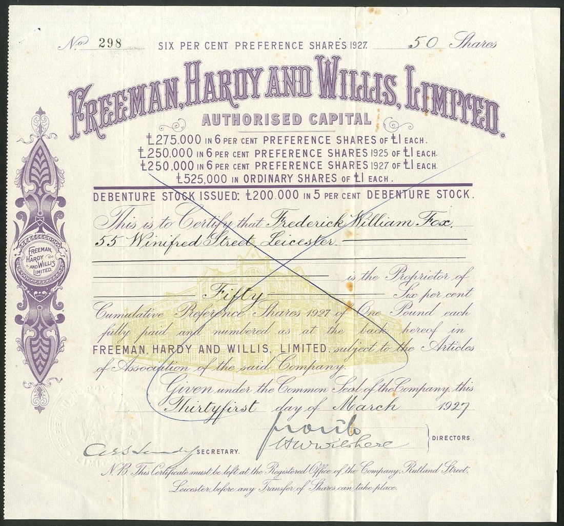 Great Britain: Freeman, Hardy and Willis Ltd., pair of certificates, 6% cumulative preference shares 1925, £1 each, fully paid, 19[26], no.1453, together with 6% cumulative preference shares 1927, £1 each, 19[27], #298, underprint vignette of the company´s London offices and store, green and purple respectively. Company formed in 1875 for the retail of shoes. Became one of the best known chain stores with shops in most towns of the United Kingdom. Acquired by Sears in 1929 but the name was retained as Freeman Hardy Willis and the FHW monogram. The name finally disappeared from the high street in 1996. Both VF, letter with a few small marks (2).