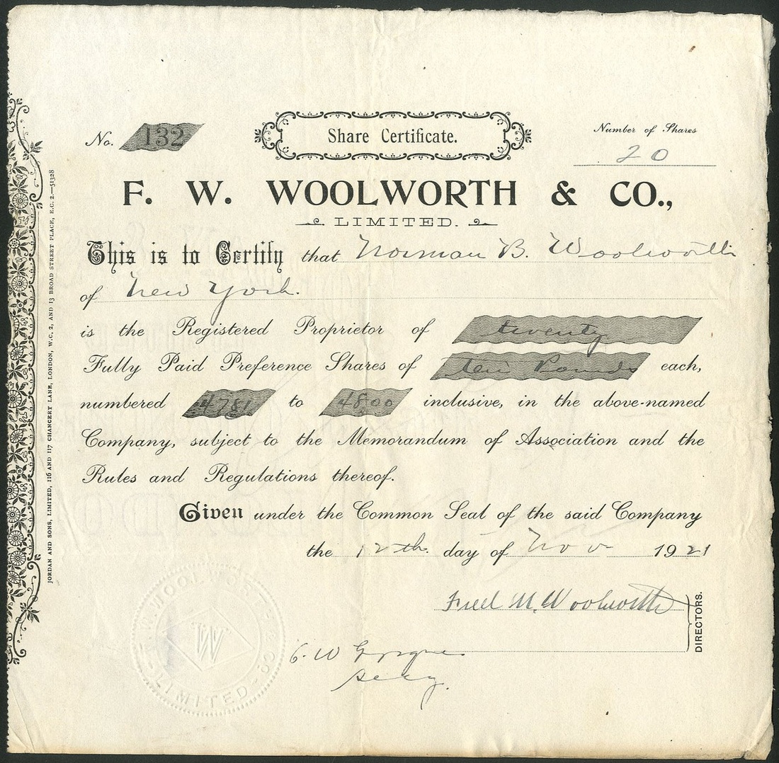 Great Britain: F.W. Woolworth & Co. Ltd., preference shares of £10 each, 19[21], #132, black. Company founded by American, Frank Woolworth in 1909 to become a much loved household name on the British high street. Name changed to Woolworths Group plc in recent times. Collapsed in 2008 and only the online store survives after the name was purchased by Shop Direct. VF and scarce.