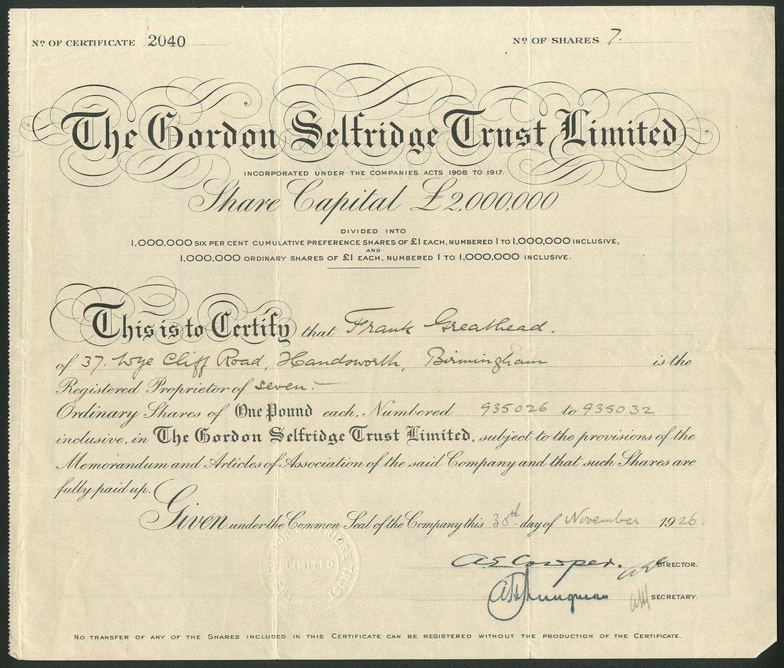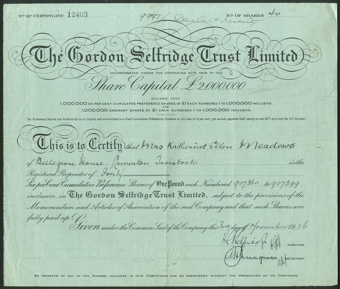 Great Britain: Gordon Selfridge Trust Ltd., a pair of certificates, ordinary £1 shares, 19[26], #2040, black, and 6% cumulative preference shares, also 19[26], #12403, black on green paper. Formed in 1926 as a holding company to acquire the whole ordinary capital of Selfridge and Co., in order to raise quick capital. VF (2).