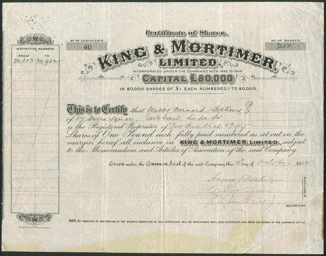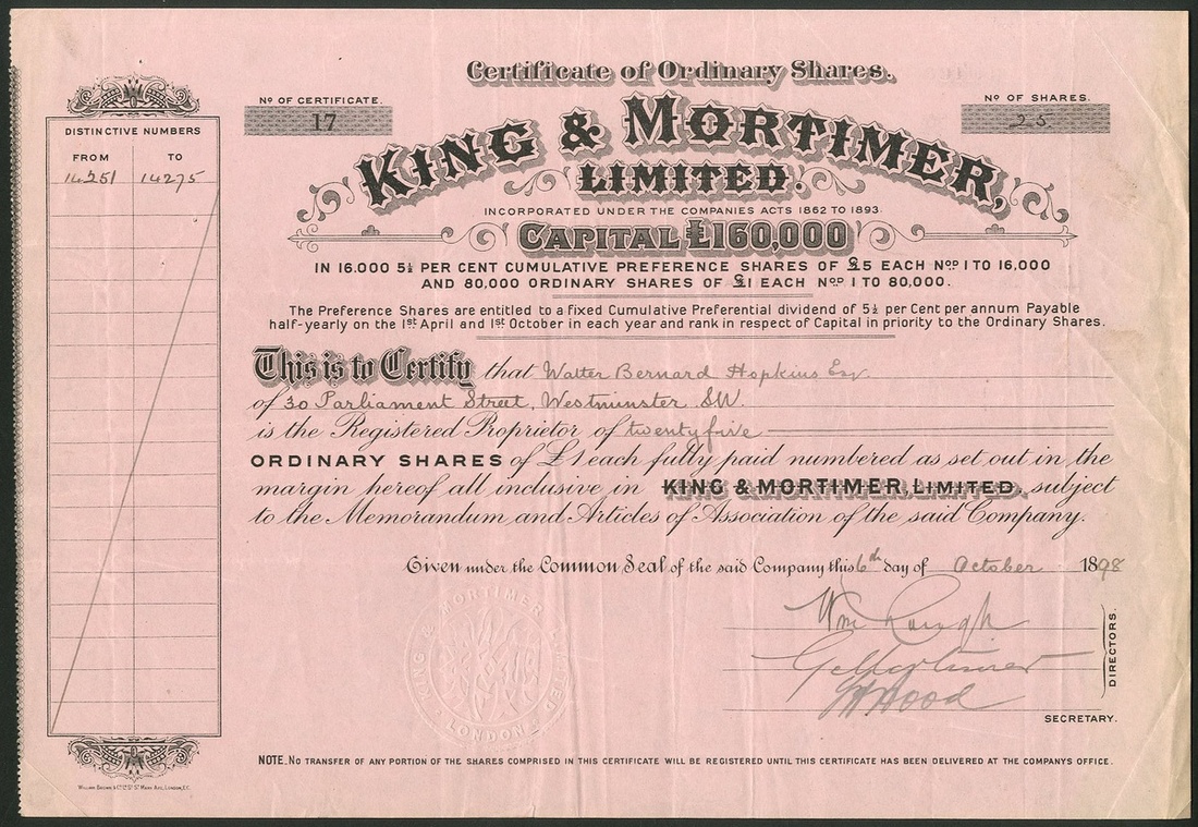 Great Britain: King & Mortimer Ltd., ordinary shares of £1 each, 18[98], #17, capital £160,000, black on pink paper, together with £1 shares, 19[02], #40, capital reduced to £80,000, black. Grocers in London. Both VF (2).