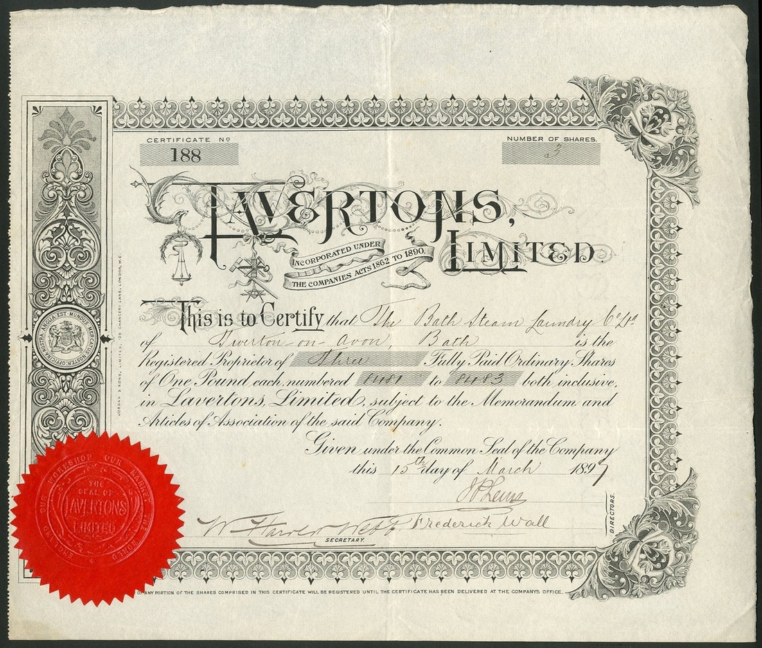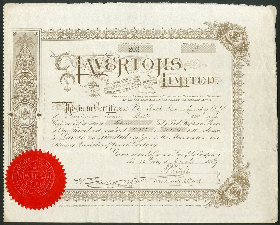 Great Britain: Lavertons Ltd., a pair of certificates, 189[7], preference shares and ordinary shares of £1 each, #203, brown and #188, black, both with red paper seal. Cabinet makers and upholsterers, furniture and carpet suppliers in Newport and Bristol. VF (2).