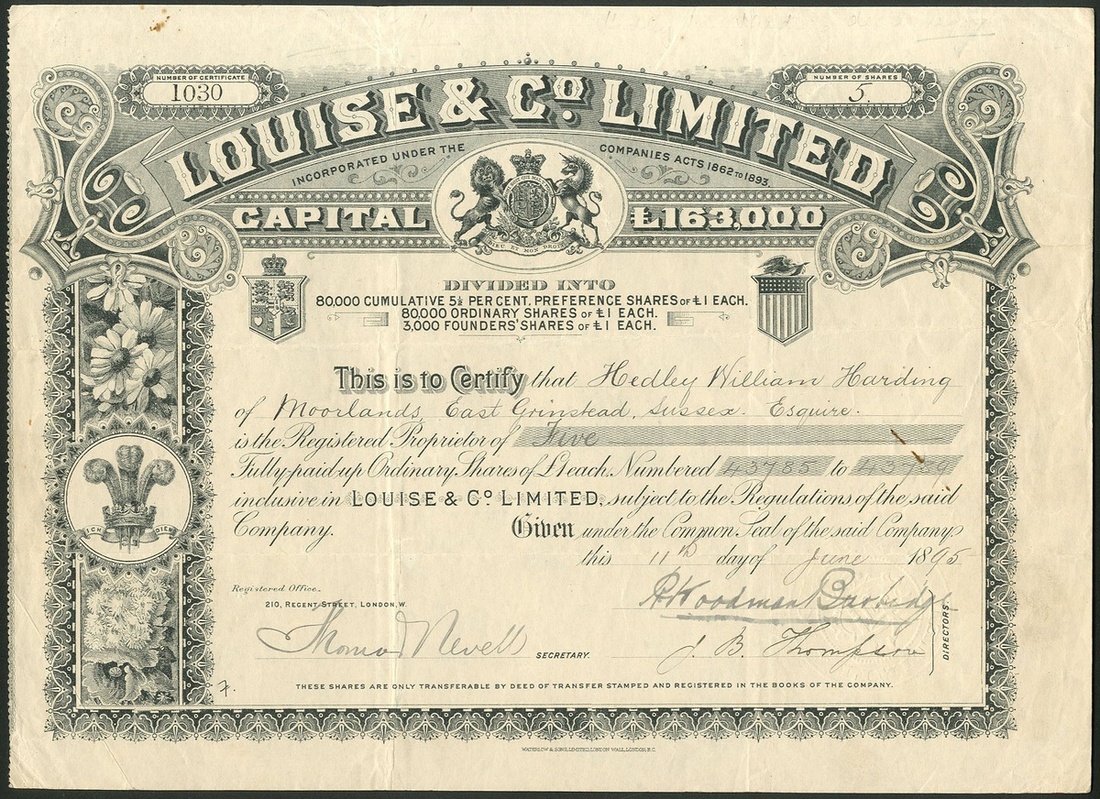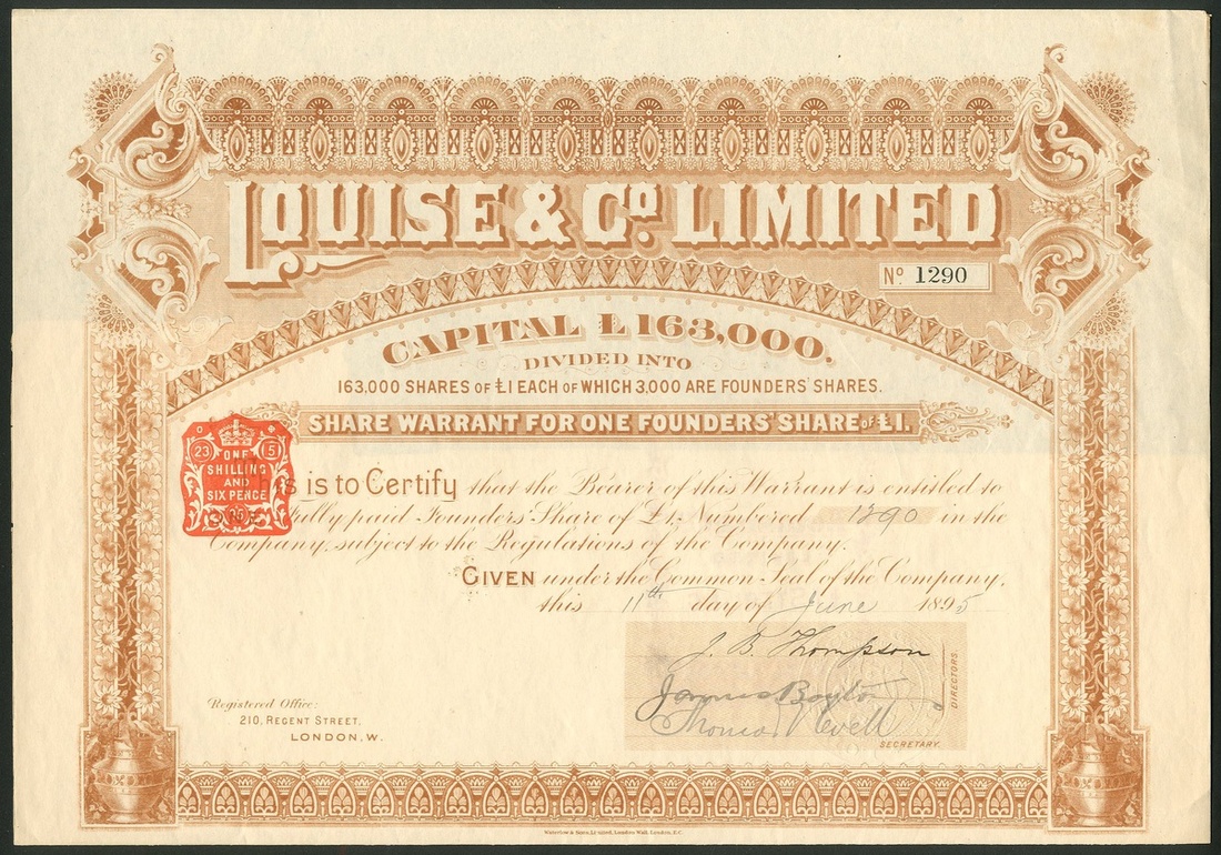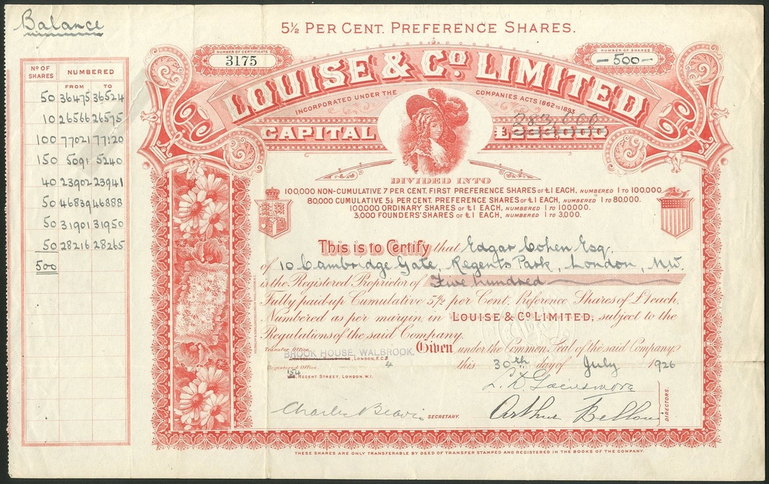 Great Britain: Louise & Co. Ltd., a group of certificates comprising, £1 preference shares, 18[96], and £1 ordinary shares, 18[95], both signed by R. Woodman Burbidge as director, attractive pieces printed by Waterlow & Sons, with USA and English arms, Prince of Wales´ feathers, red and black respectively; together with bearer warrant for one founders´ share of £1, 189[5], brown, with coupons, and later issued cumulative pref. shares of £1 each, 1[926], red. R.Woodman Burbidge, Chairman of Harrods from 1890 to 1917. Repaired splits on the later piece, AVF (4).