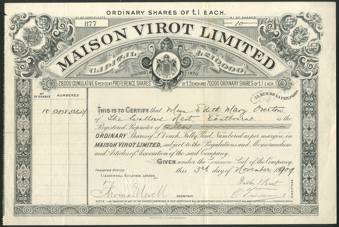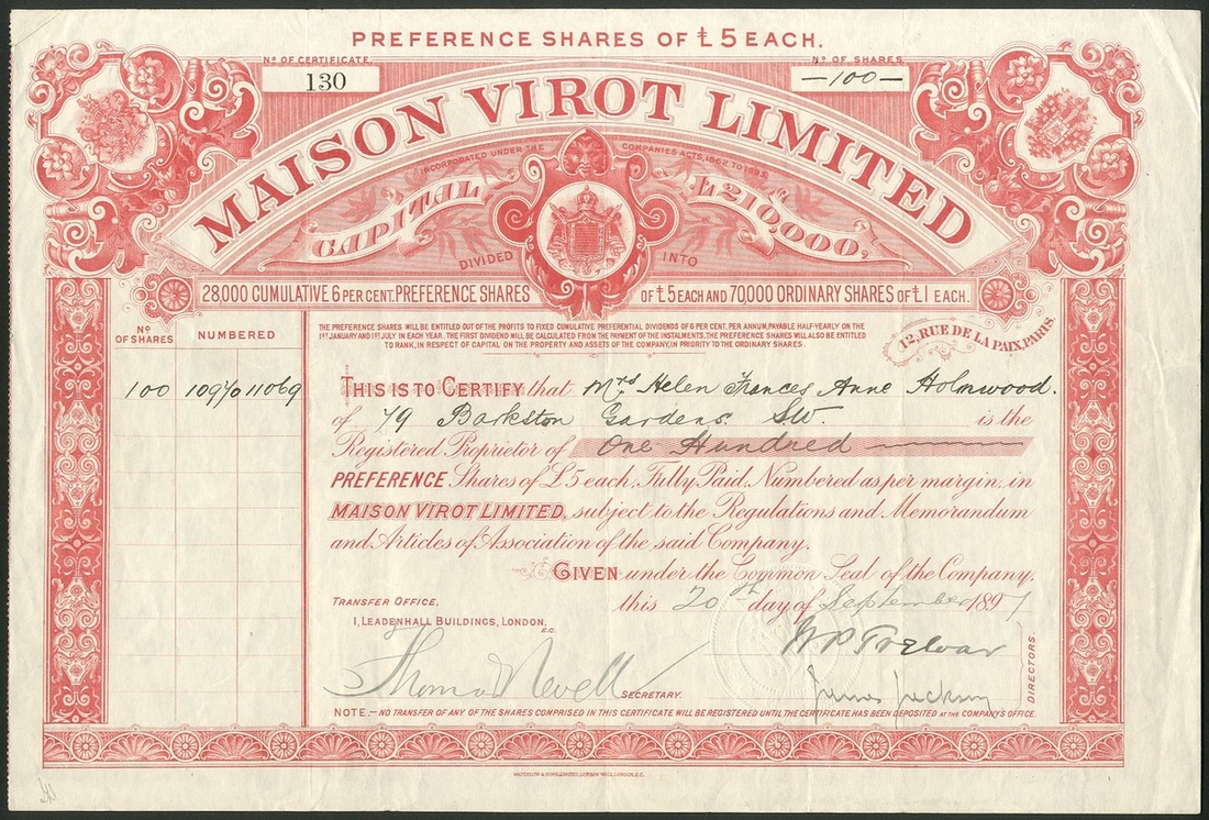 Great Britain: Maison Virot Ltd., a pair of certificates, ordinary shares of £1, 189[909], #877, and preference shares of £5, 189[7], #130, ornate border with scrollwork, black and red respectively. Ladies millinery business located on the Rue de la Paix, Paris. VF (2).