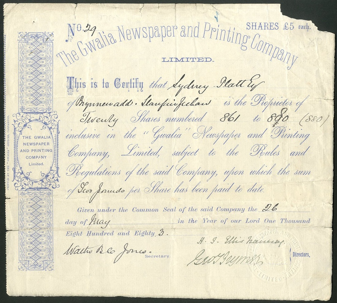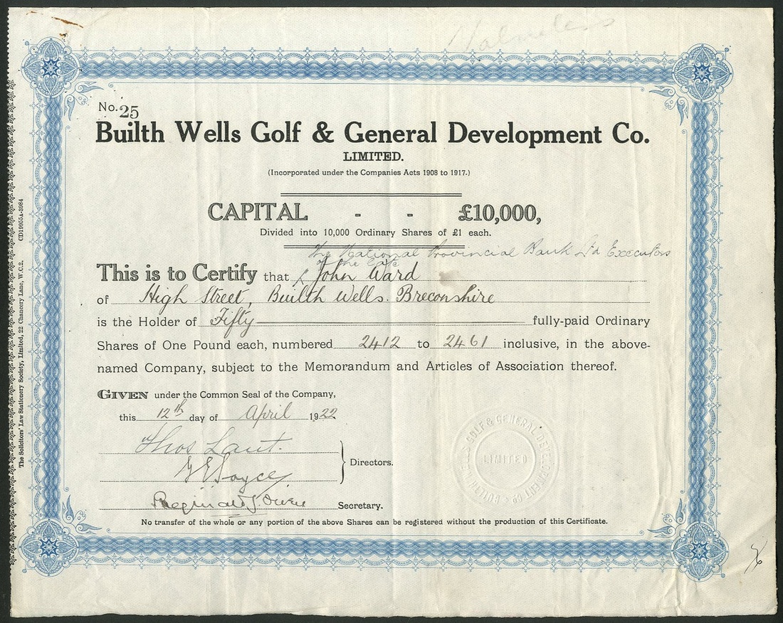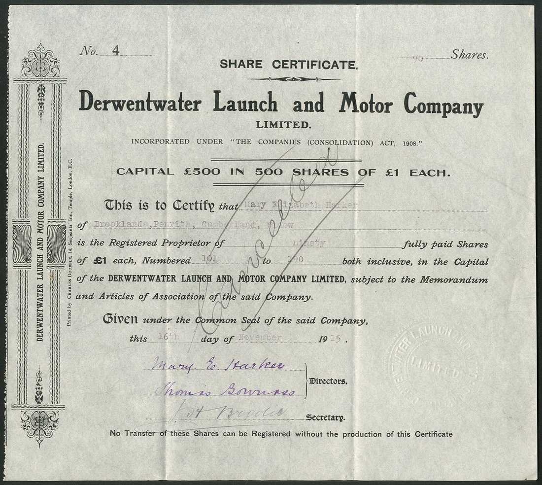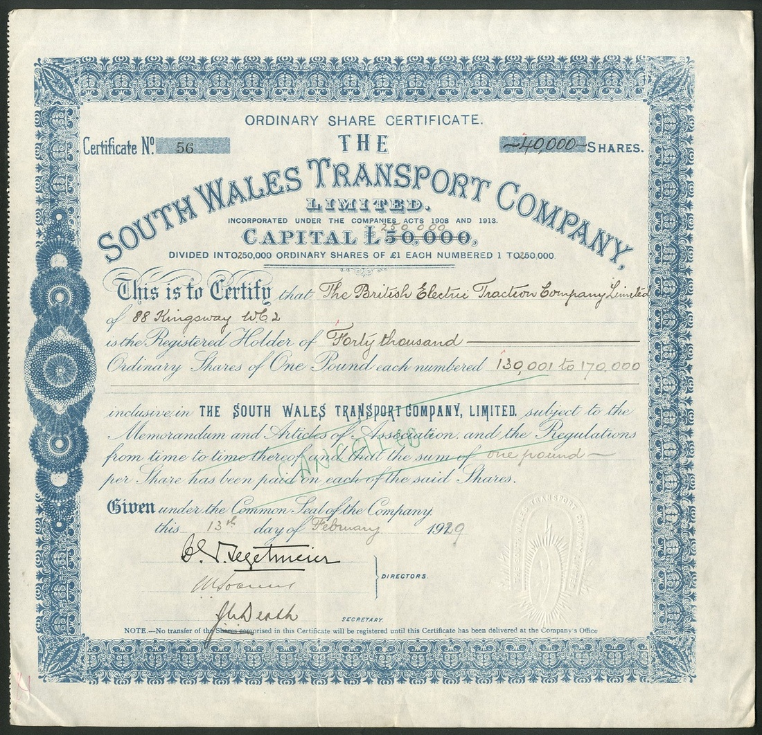 Great Britain: A Miscellaneous group comprising, Derwentwater Launch and Motor Company Limited, £1 shares, 19[15], #4, cancelled, rare; Builth Wells Golf & General Development Co. Ltd., £1 shares, 19[22], #22; Gwalia Newspaper and Printing Company Ltd., £5 shares, 188[3], #29, damaged; South Wales Transport Co. Ltd., £1 shares, 191[29], #56, and, Clayton & Shuttleworth Ltd., £1 ordinary shares, 19[01], #714. VF unless stated (5). NO RESERVE.