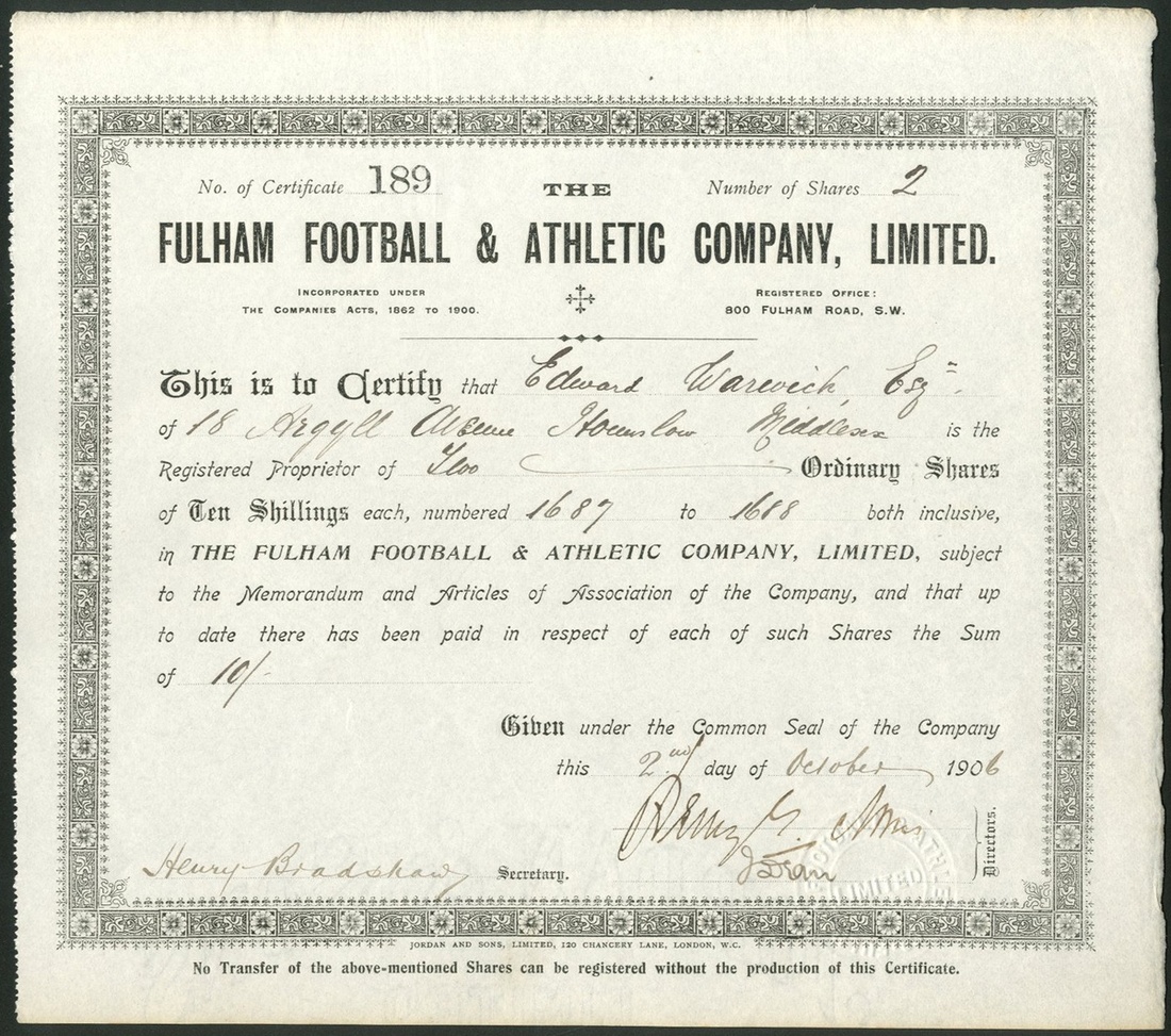 Great Britain: Fulham Football & Athletic Co. Ltd., 10 shilling shares, 190[6], #189, ornate border, black. Signed by Henry Norris and John Dean. The first company associated with this club. Together with 2 copy photographs of the team and 2 modern certificates of Celtic Football Club. AEF (5)