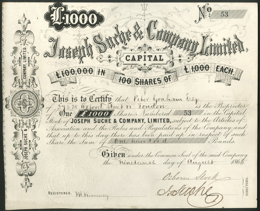 Great Britain: Joseph Suche & Co. Ltd., £1000 share, £100 paid, #53, 186[5], black on thick waxed paper. Extremely high denomination share of which only 100 were issued. VF and rare.
