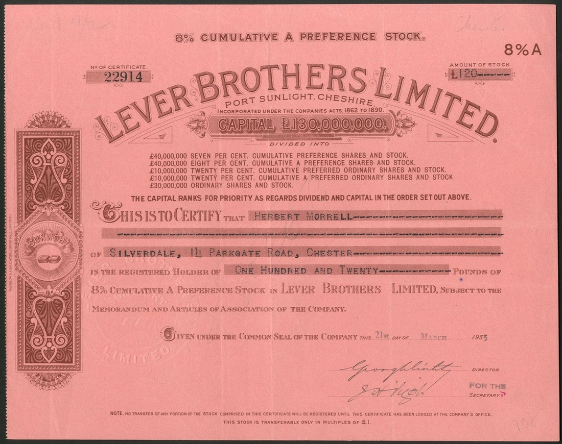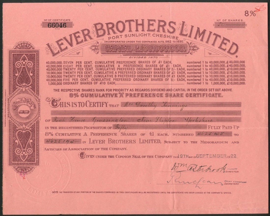 Great Britain: Lever Brothers Ltd., pair of certificates, 8% preference shares of £1 each, 19[22], #66046, mauve on pink paper, and 8% cumulative A preference stock, 193[5], #22914, brown on pink paper. Famous soap manufacturers. GVF (2).
