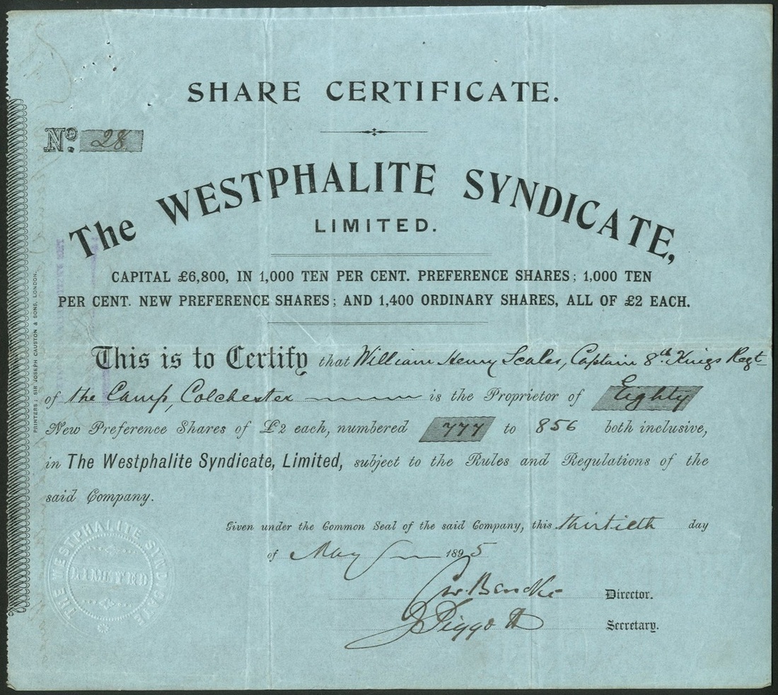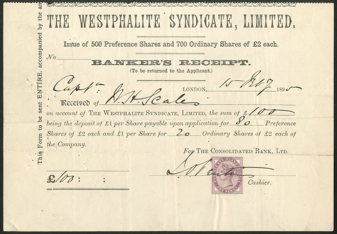 Great Britain: Westphalite Syndicate Ltd., a pair of certificates for £2 shares, ordinary shares and preference shares, both 189[5], #22 on white paper and #28 on blue paper respectively. Together with bankers receipt. Westphalite was a popular mining explosive, based on ammonium nitrate, produced in Germany. This company was to acquire the rights for Great Britain and the colonies for its manufacture. VF (2).