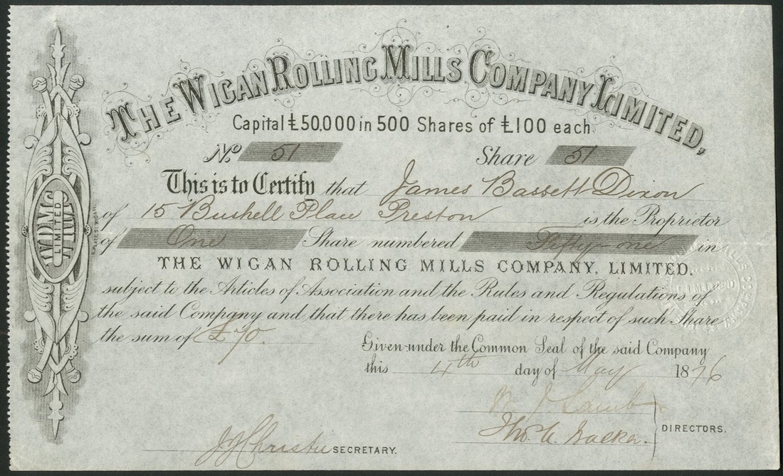 Great Britain: Wigan Rolling Mills Co. Ltd., £100 share, 18[76], #51, decorative black printing. GVF.