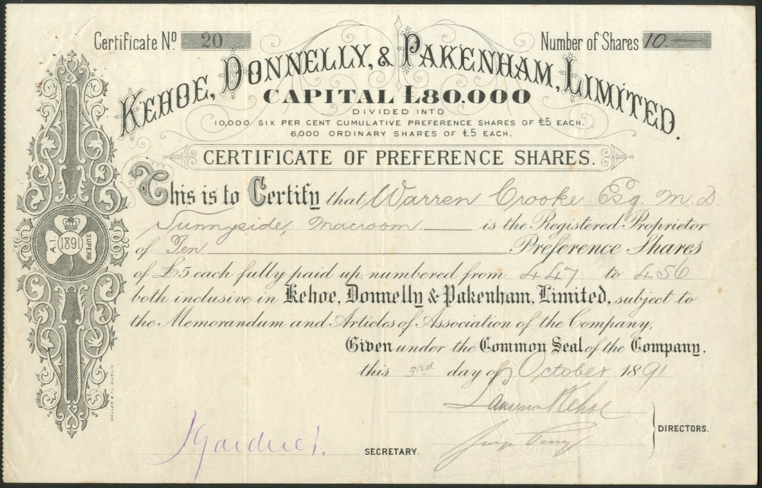 Great Britain / Ireland: Kehoe, Donnelly & Pakenham Ltd., preference shares of £5 each, 18[91], #20, decorative black printing. VF.