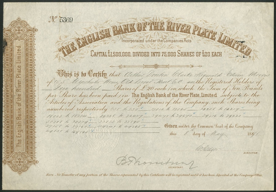 Argentina: English Bank of the River Plate Ltd., £20 shares, 188[91], #5369, decorative title, brown, printed by Bradbury, Wilkinson & Co. VF.
