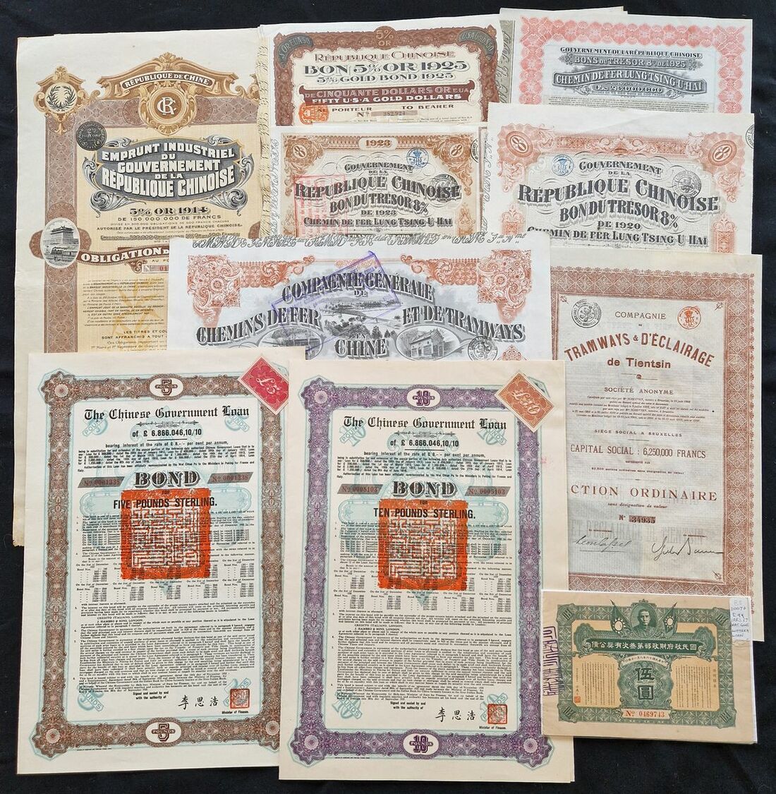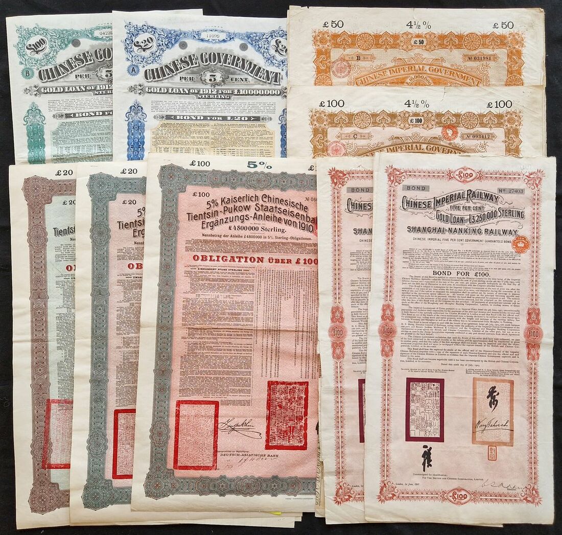 China: A collection of Chinese bonds & shares, comprising, 1898 Gold Loan, £50 and £100, issued by DAB; 5% Gold Loan, 500 francs, 1905 and 1907; Shanghai Nanking Railway, £100, 1905 and 1907; Tientsin Pukow Railway, 1908, £20 and 1910, £20, 2 examples and £100; 1912 'Crisp' Loan, £20, 2 examples and £100; 1914 Industrial Loan, 500 francs; 1925 Skoda Loan, £5 and £10; 1925 'Boxer' Loan, $50, 4 examples; Lung Tsing U Hai Railway, 1920, 1923 and 1925, and other certificates (3). Generally VF and a useful lot (26).