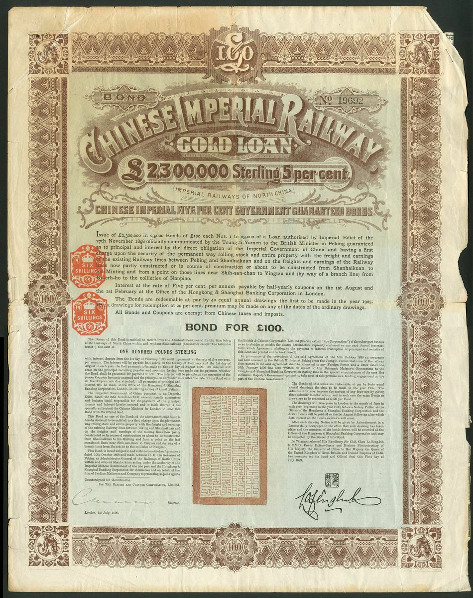China: 1899 Chinese Imperial Railway 5% Gold Loan, £100 bond, #19692, large format, ornate border, brown with pale blue underprint, red 'chop' in centre, with coupons. Top half somewhat toned and a few small edge tears. Top right corner cut at 45% not affecting the design. AVF.