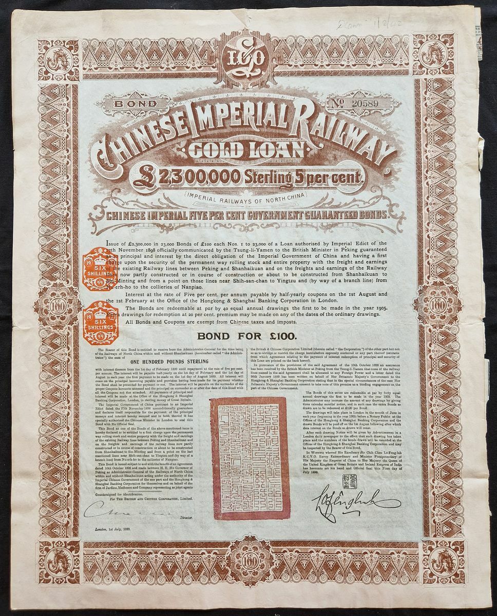China: 1899 5% Imperial Railway Gold Loan, bond for £100, #20589, large format, ornate border, brown, blue underprint, with coupons. Better than usual, GVF.