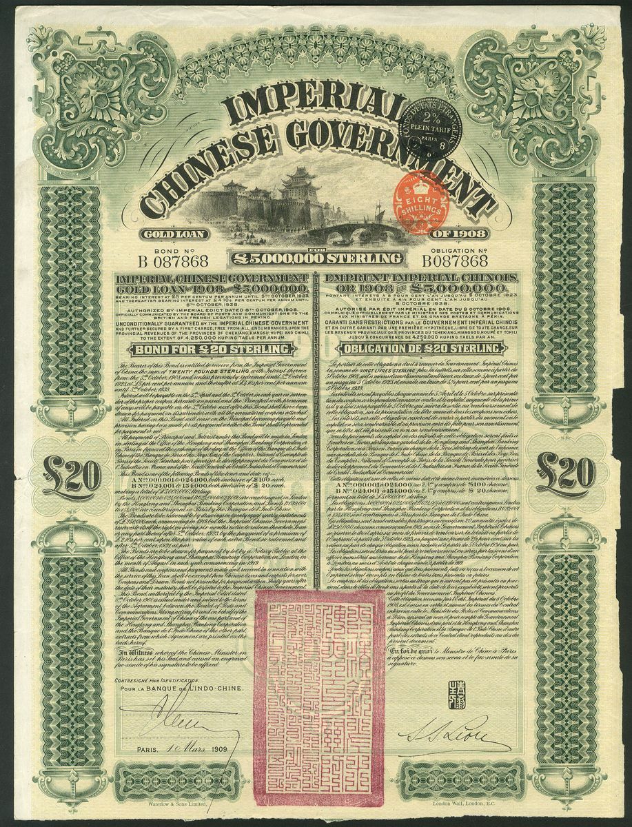 China: 1908 5% Gold Loan, bond for £20 issued by the Banque de L'Indo-Chine, #B087868, walled city at top, green and black, red chop bottom centre, printed by Waterlow, no coupons remain as is usual. Small edge tear, GVF.