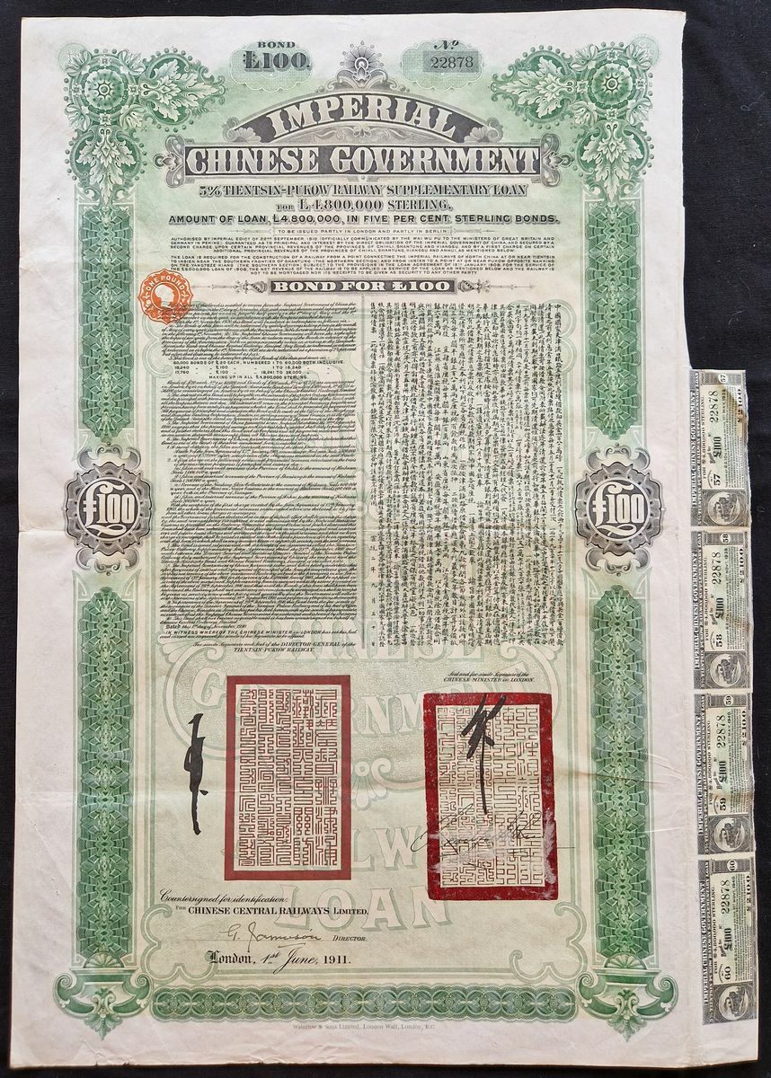 China: 1910 5% Tientsin-Pukow Railway Supplementary Loan, bond for £100, issued by Chinese Central Railways, #22878, large format, green, printed by Waterlow, with coupons.