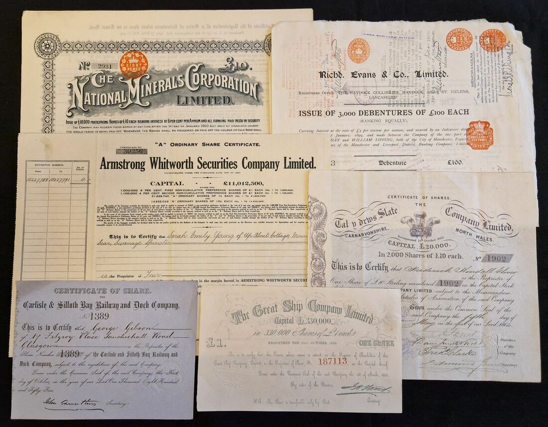 Great Britain: A small group of British certificates, comprising Carlisle & Silloth Bay Railway & Dock Company, 1855; Great Ship Company Limited, 1859; Tal y Drws Slate Company Ltd., 1864; Armstrong Whitworth Securities Co. Ltd., 1929, 2 examples; Richard Evans & Co. Ltd., 1899, Haydock Collieries, and National Minerals Corporation Ltd., 1908. Generally VF (7).