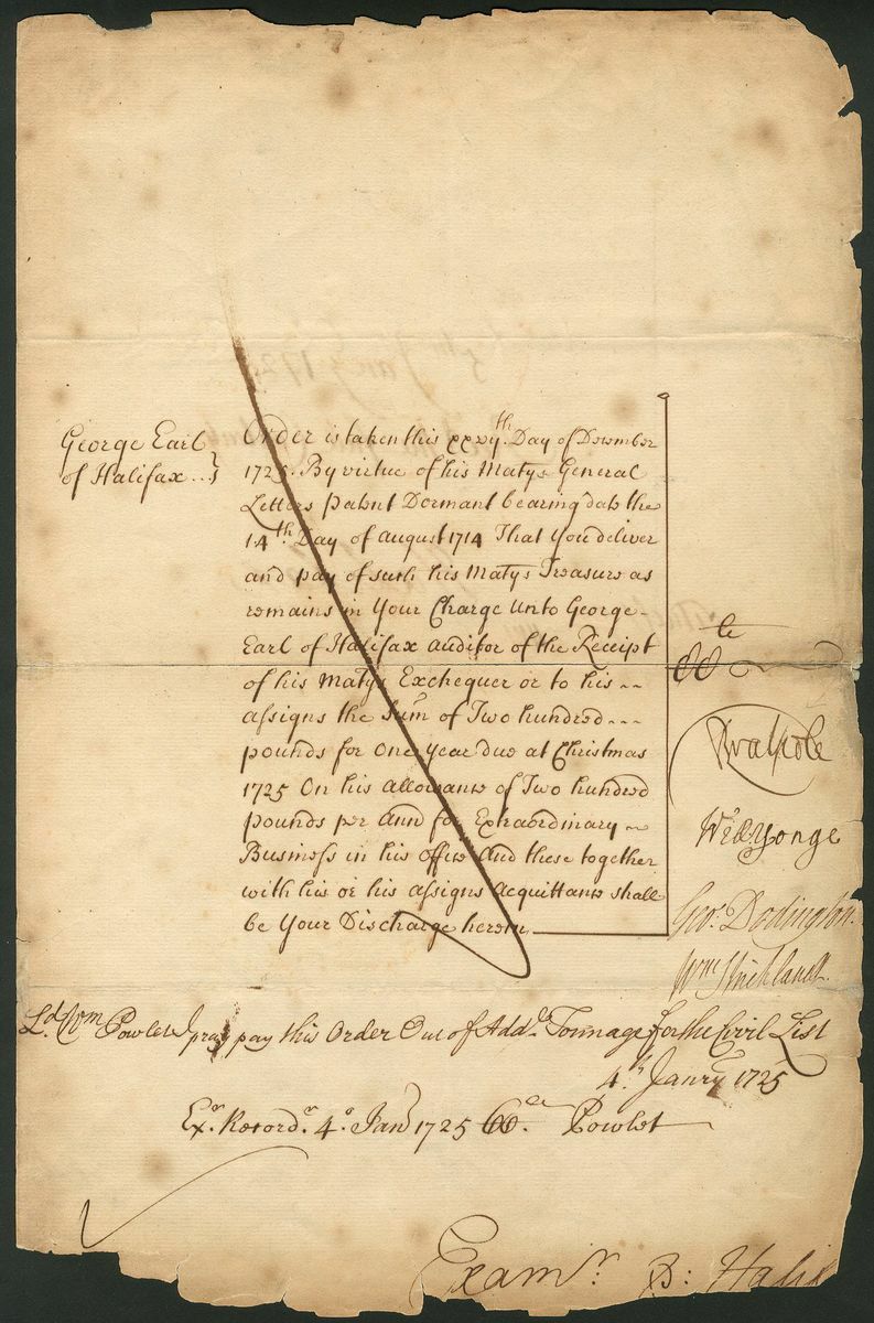 Great Britain: Order of Payment, 1725, for a payment of £200 to George, Earl of Halifax, for his allowance for 'Extraordinary Business' of his office as Auditor of the Receipt of the Exchequer. Handwritten on 4 sheets, signed by Robert Walpole, William Yonge, George Dodington and William Strickland. Also a signature of Halifax on reverse. Sir Robert Walpole, 1st Earl of Orford, 1st prime Minister of Great Britain; Sir William Yonge, 1st Baronet, sat in the House of Commons, 1715 to 1754; George Bubb Dodington, 1st Baron Melcombe, sat in the House of Commons, 1715 to 1761; Sir William Strickland, 4th Baronet, sat in the House of Commons, 1708 to 1735. Separated along folds, brittle with some edge loss.