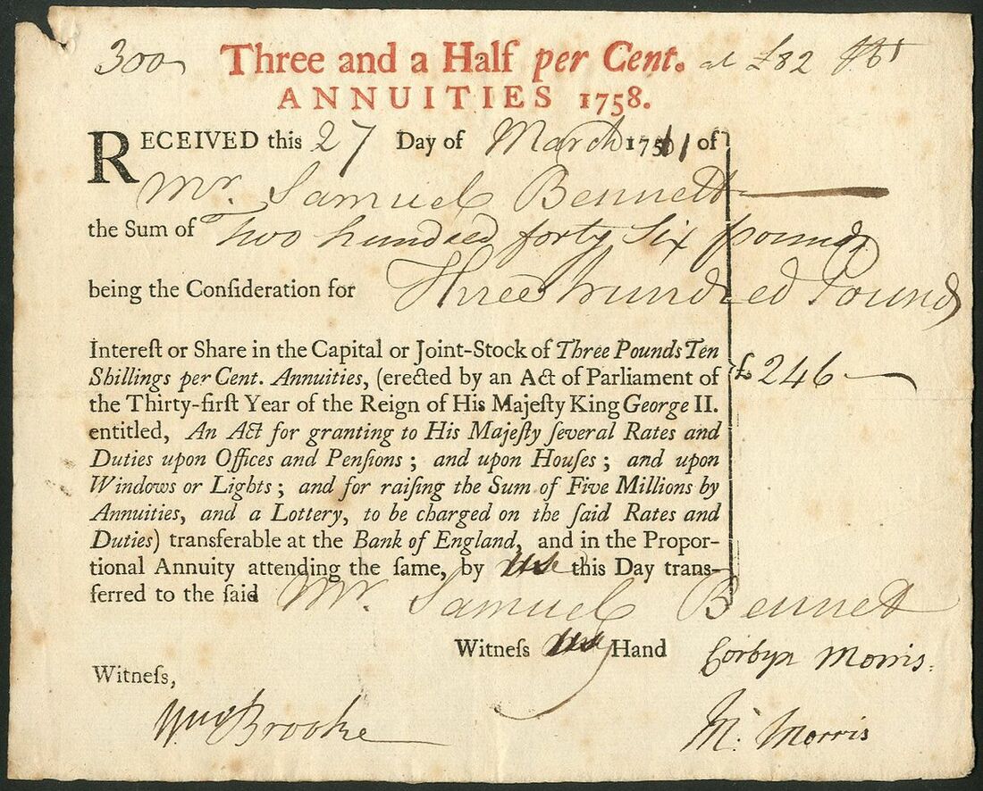 Great Britain: Three and a Half per Cent. Annuities 1758, an inscribed stock certificate, 175[61], for £300 stock at £246, red and black printing. Usual spike damage at top left corner otherwise VF and a very scarce type, only in existence for a few years.