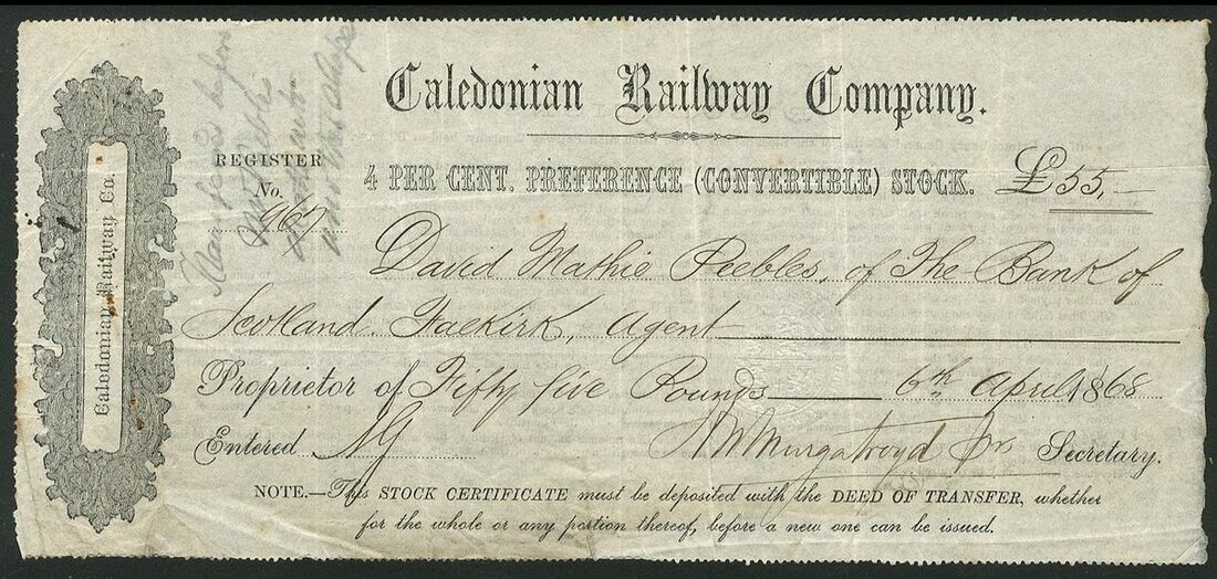 Great Britain: Caledonian Railway Company, 4% preference (convertible) stock, certificate for £[55], 18[68], #967, scrollwork left, black, embossed seal. Rusty pinholes otherwise AVF and scarce type.