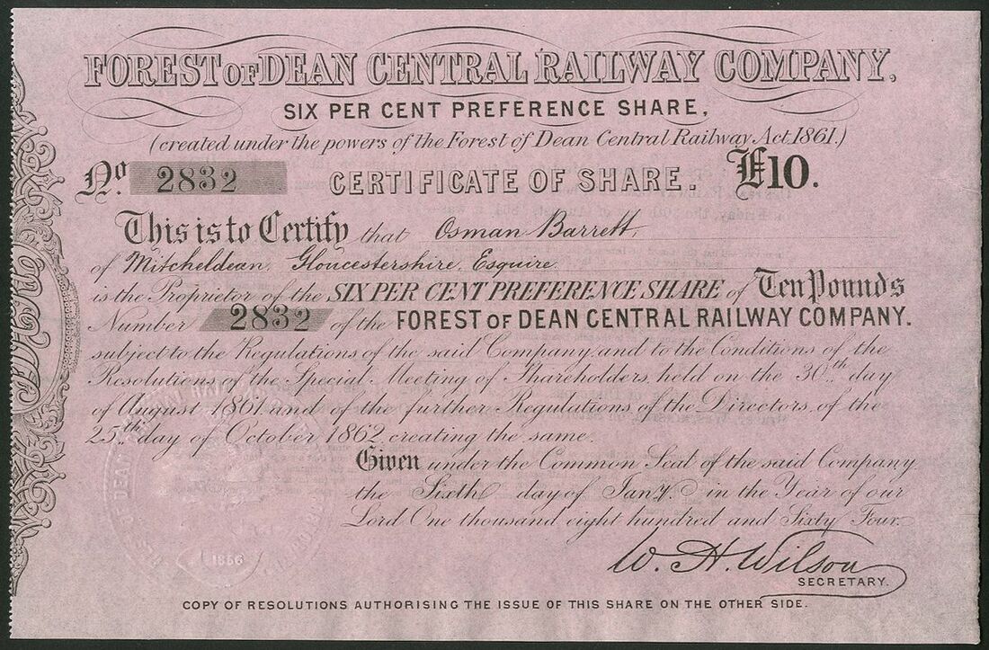 Great Britain: Forest of Dean Central Railway Co., £10 6% preference share, 1864, #2832, black on pink paper, printed by Waterlow & Sons. Incorporated in 1856 to build a broad gauge line from the South Wales Railway near Brimspill to Howbeach Valley, plus a short branch line. Opened in 1868 and worked by the Great Western Railway with whom it merged in 1923. EF.