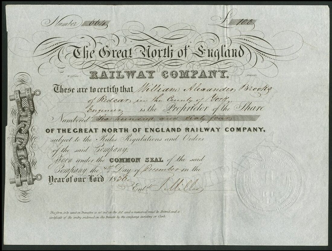 Great Britain: Great North of England Railway Company, £100 share, 18[36], #664, attractve chain vignette at left, black, attractive seal. GVF and scarce early date.