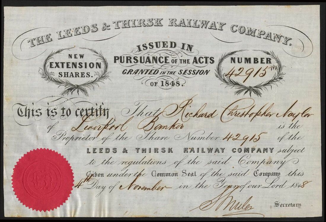 Great Britain: Leeds & Thirsk Railway Company, certificate for one New Extension share, 184[8], #42915, ornate printing, black, pink seal, printed on linen. AEF.
