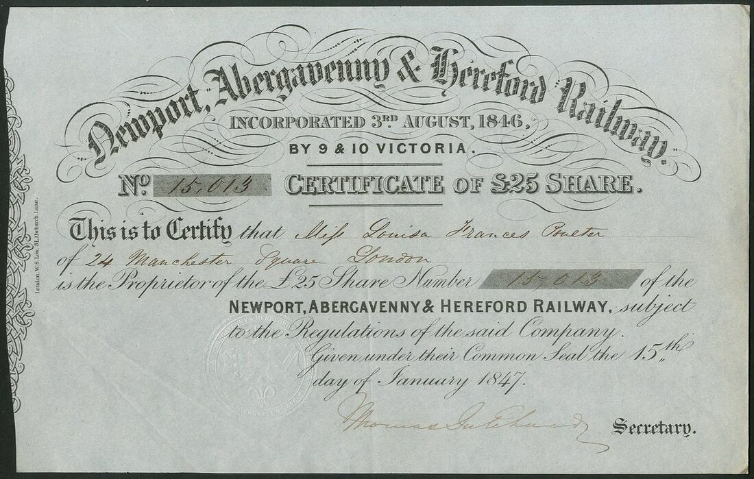 Great Britain: Newport, Abergavenny & Hereford Railway, £25 share, 1847, #15013, scrollwork at left, black. A 33 mile line to connect the towns, opened in 1854 using the trackbeds of older tramroads. In 1860 the line amalgamated with the Oxford, Worcester and Wolverhampton and the Worcester and Hereford Railways to form the West Midland Railway, following rebellion against the London & North Western Company. Near EF and scarce.