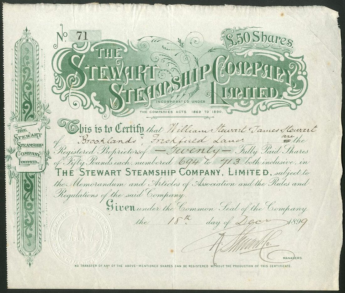 Great Britain: Stewart Steamship Company Limited, £50 shares, 189[9], #71, green, ship vignette in embossed seal. Registered in 1896 to acquire the S.S. Commonwealth, based in Liverpool. Winding up notice in 1900. GVF and rare.