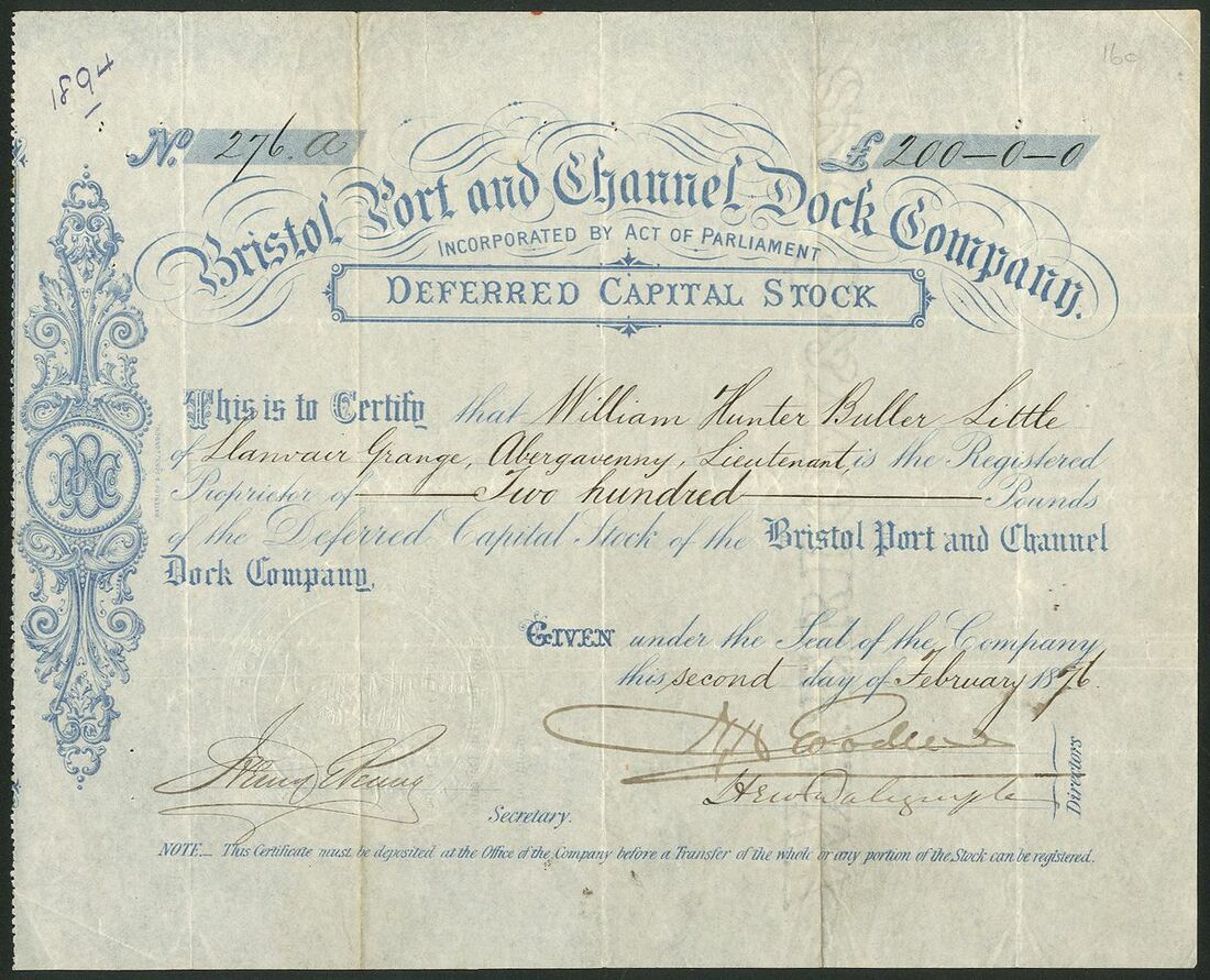 Great Britain: Bristol Port and Channel Dock Company, deferred capital stock, 18[76], #276, scrollwork at left, blue, printed by Waterlow & Sons. The company built Avonmouth Dock which was opened in 1877. Acquired by the Port of Bristol Authority in 1884. AVF and scarce.