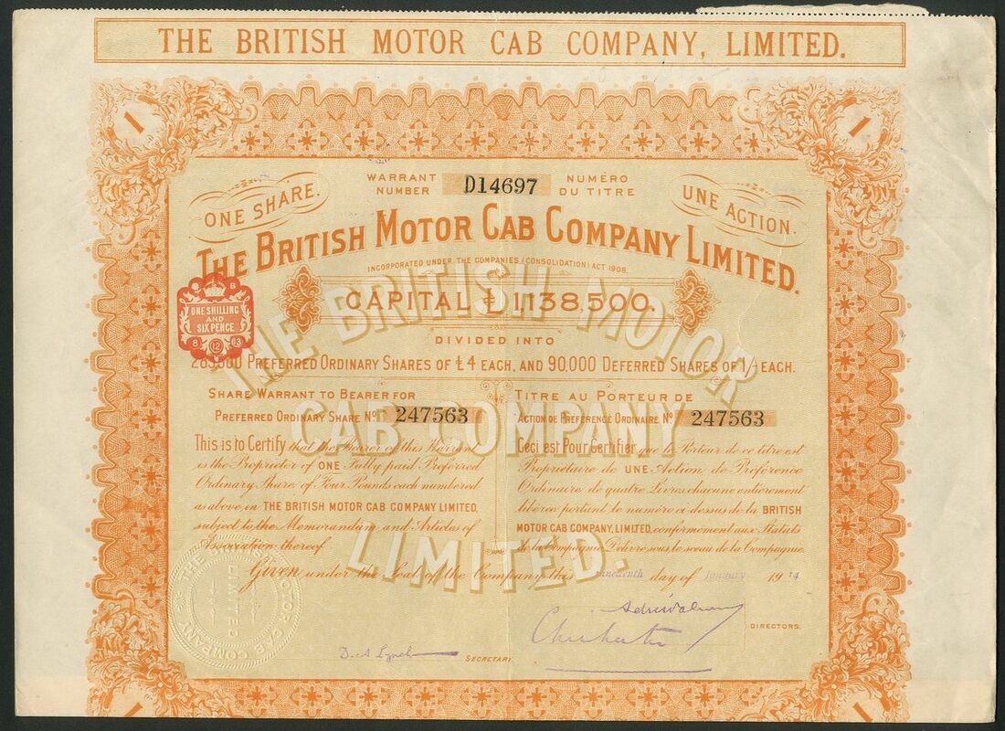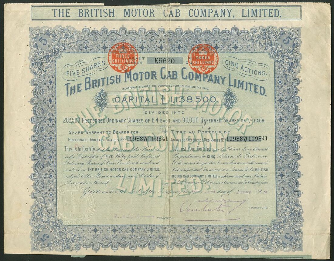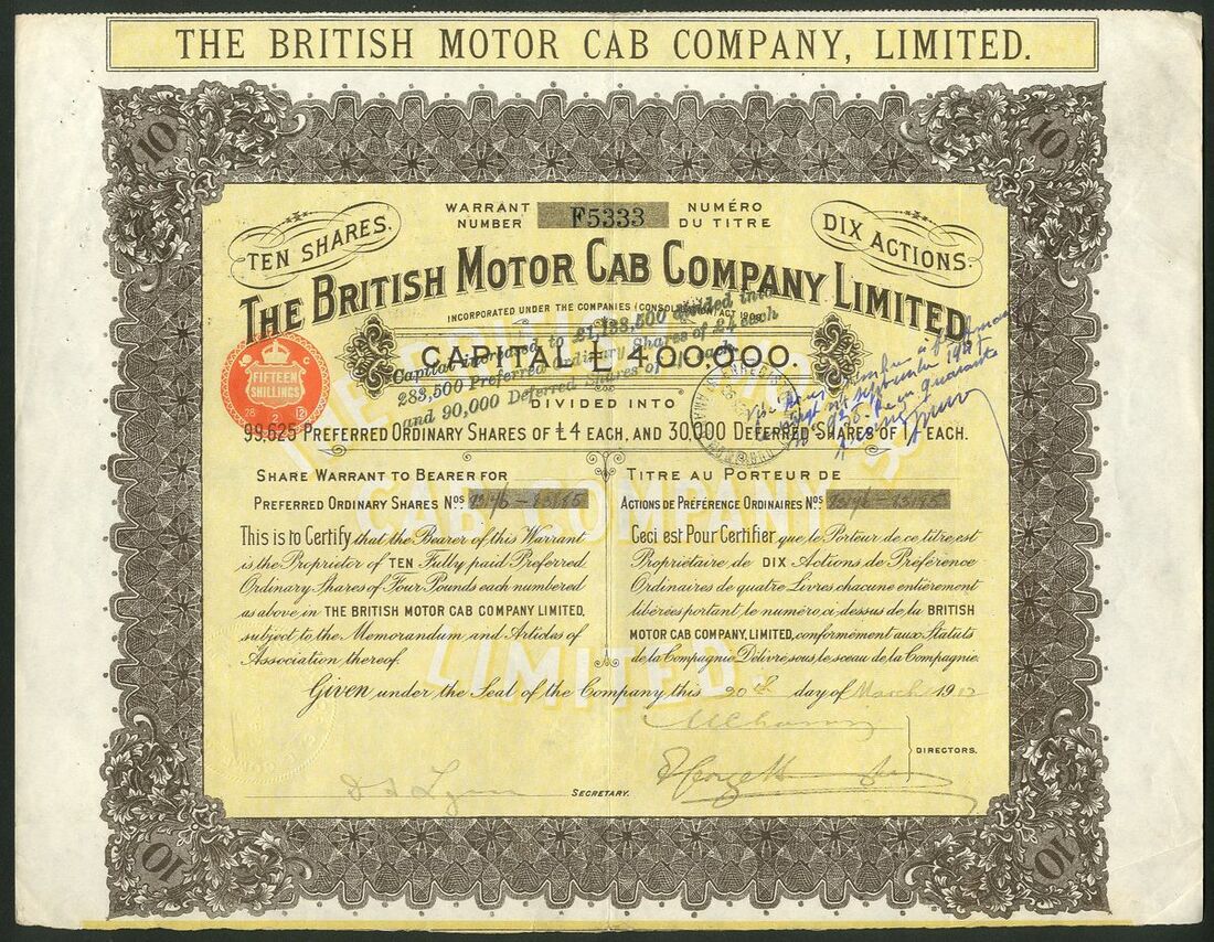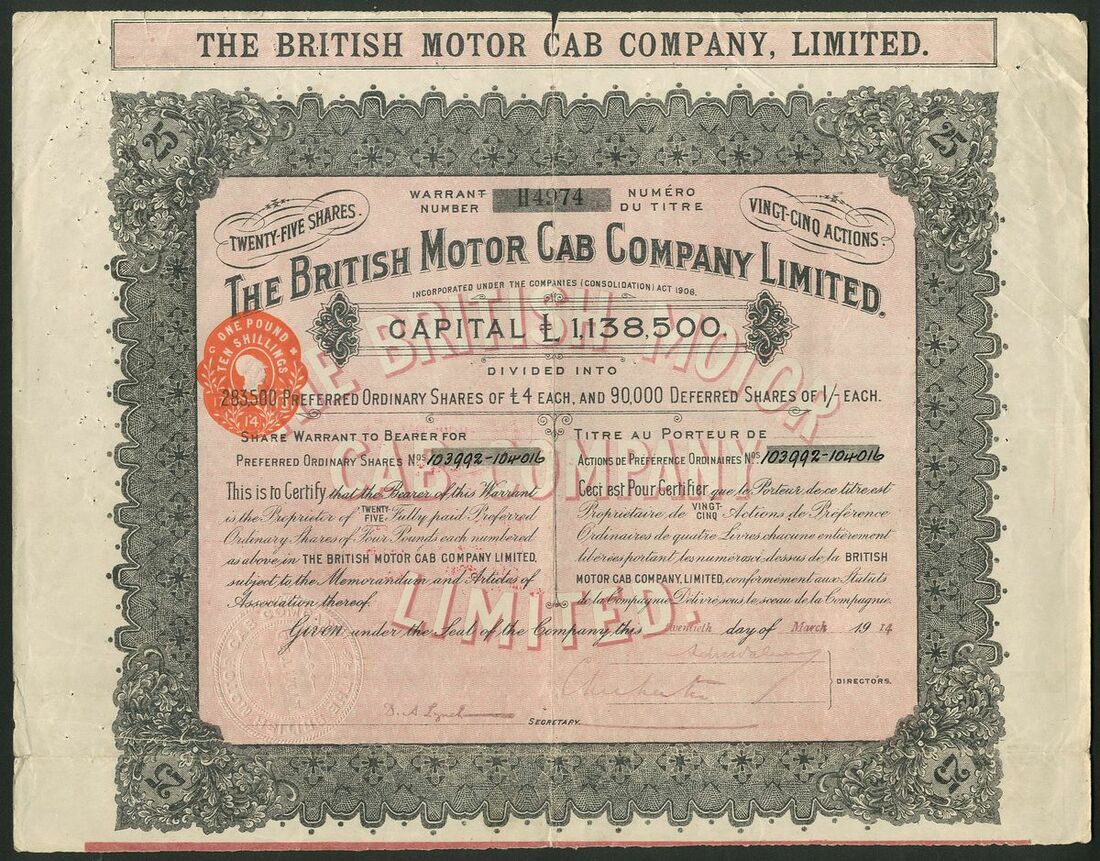 Great Britain: British Motor Cab Company Limited, a group of Preferred Ordinary share certificates dated 1910 to 1914 comprising 1 share, yellow (11), 5 shares, blue (2), 10 shares, brown and yellow (2) and 25 shares, black with pink underprint (4), no coupons remain as is always the condition for this issue (Deferred shares mostly come with coupons), uneven botton edges, liquidators endorsements on reverse. Mixed condition F to VF (19).