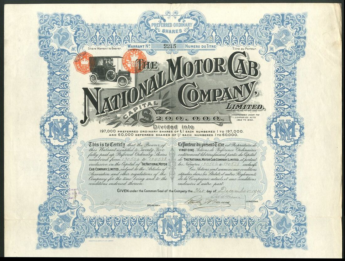 Great Britian: National Motor Cab Co. Ltd., bearer warrant for 25 preferred ordinary shares of £1, [1910], #2215, attractive large format piece with early motor cab at top left, ornate border, blue and black, with coupons. Based in Hammersmith, one of the largest operator with some 250 red coloured cabs supplied by French manufacturer UNIC. The boom in cabs was shortlived and the company had to reduce its fleet mainly by converting them to delivery trucks. The company was reorganised as National Motor Cab (1922) Ltd., and diversified into other areas of the motor trade becoming concessionaires for the KRC light car. GVF.