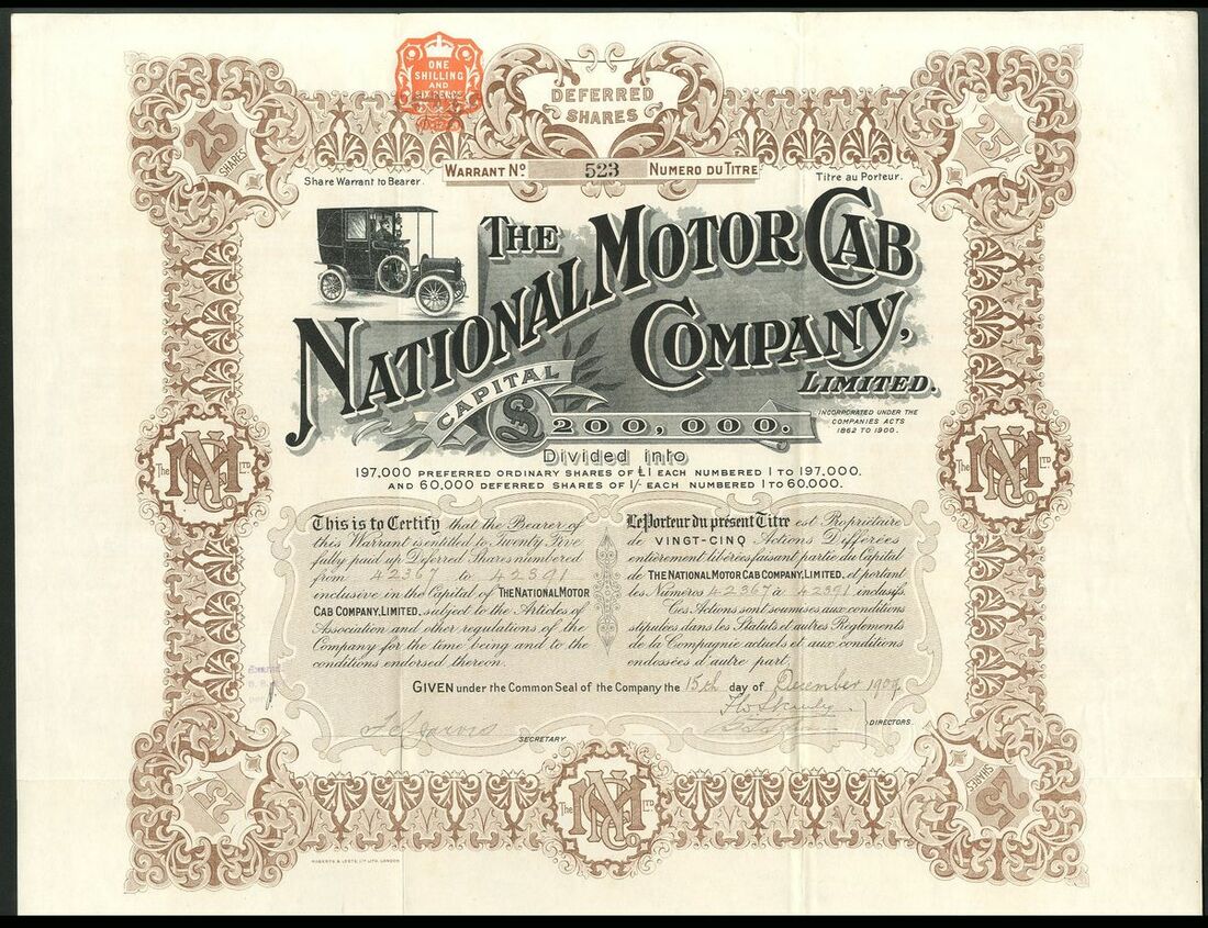 Great Britian: National Motor Cab Co. Ltd., bearer warrant for 25 deferred shares of 1/-, [1909], #523, attractive large format piece with early motor cab at top left, ornate border, brown and black, with coupons. Based in Hammersmith, one of the largest operator with some 250 red coloured cabs supplied by French manufacturer UNIC. The boom in cabs was shortlived and the company had to reduce its fleet mainly by converting them to delivery trucks. The company was reorganised as National Motor Cab (1922) Ltd., and diversified into other areas of the motor trade becoming concessionaires for the KRC light car. GVF.