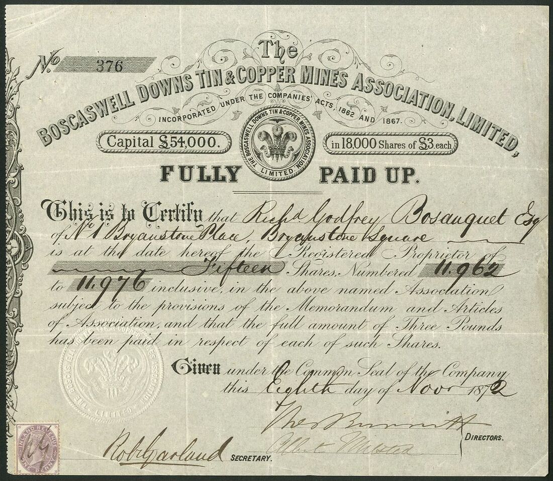 Great Britain: Boscaswell Downs Tin & Copper Mines Association Ltd., £3 ordinary shares, 187[2], #376, embossed seal and logo depicting Prince of Wales feathers, 1d revenue stamp, black. Mines located near Penzance, Cornwall. AVF and scarce.