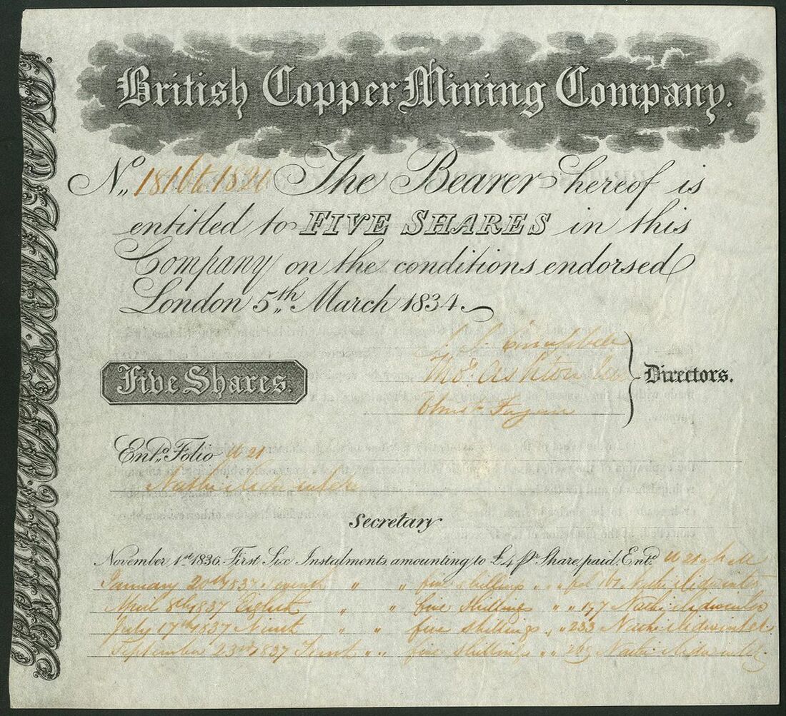 Great Britain: British Copper Mining Company, certificate for 5 shares, London 1834, #1816-1820, black printing, on vellum, rules printed on the reverse. The company held a large interest in, and managed, Great Wheal Charlotte in Chapel Porth, St. Agnes, Cornwall. AEF.