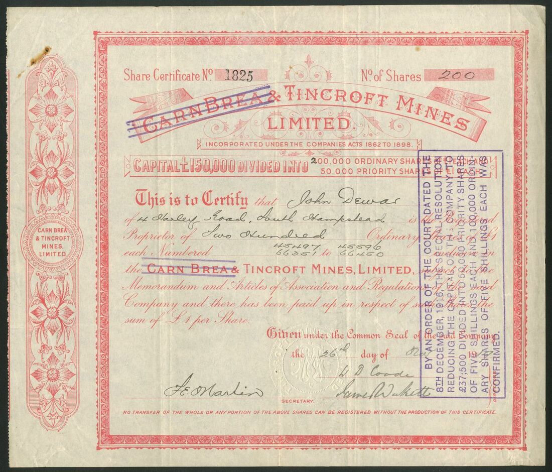 Great Britain: Carn Brea & Tincroft Mines Limited, £1 shares, 19[19], #1825, scrollwork at left, red, title changed to just Tincroft Mines Ltd. A large copper and tin producer in Cornwall that closed in 1921. Ex Spink auction April 2019. VF and scarce.