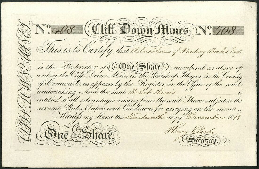 Great Britain: Cliff Down Mines, one share, 18[18], #408, black, signed by the Secretary. Mines at Illogan, Cornwall. In beautiful uncirculated condition.