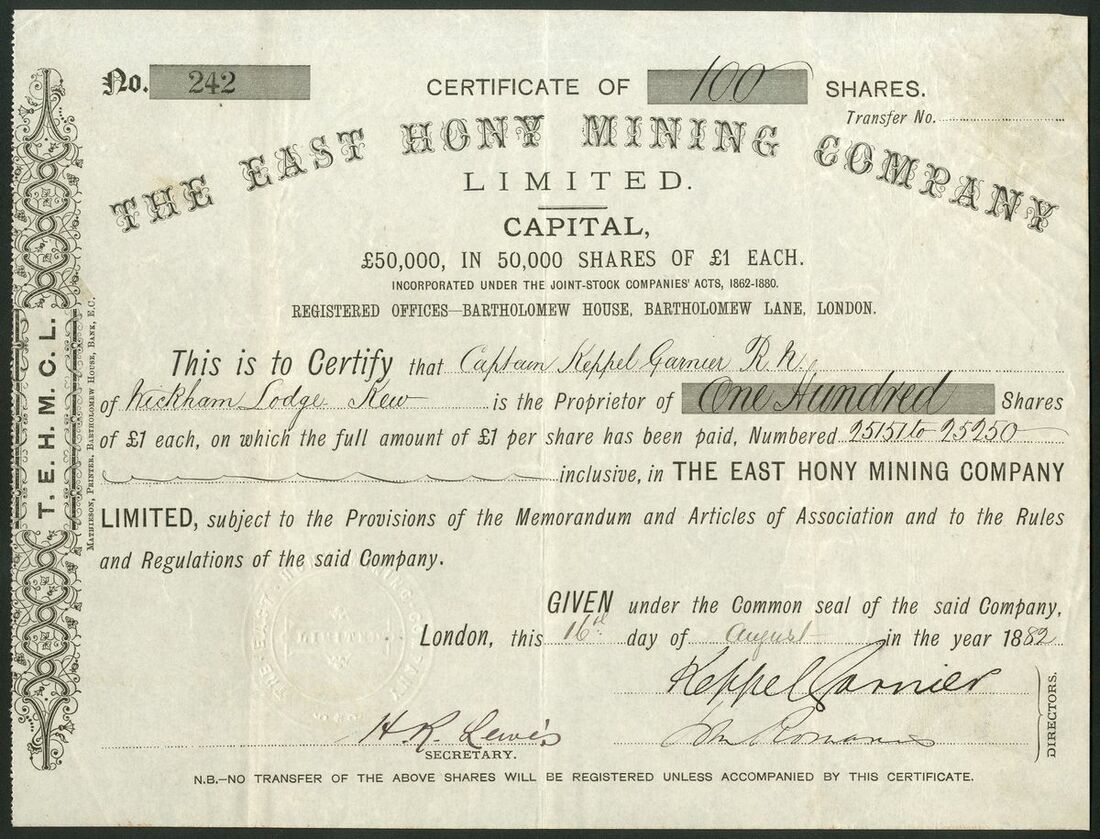 Great Britain: East Hony Mining Company Limited, £1 shares, 18[82], #242, black. VF and rare.