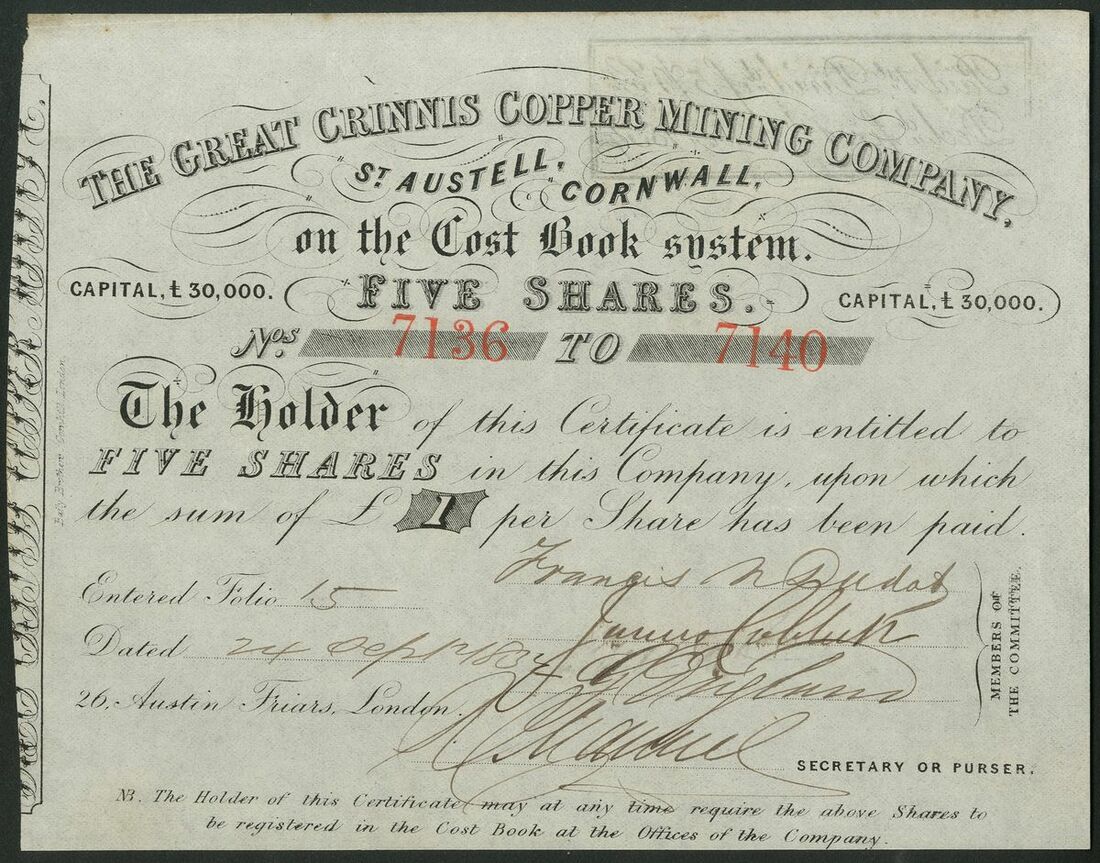 Great Britain: Great Crinnis Copper Mining Co., certificate for 5 shares of £1, [1852], #7136-40, black, red serial numbers. This Cost Book company owned copper mining rights on the coast just outside St. Austell. Workings were considerable and also extended under the sea. The Carlyon Bay Hotel now stands on the old site. EF.
