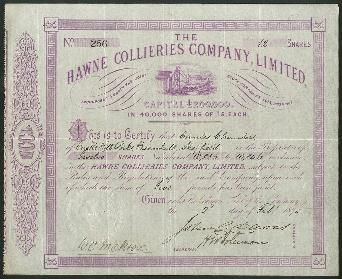 Great Britain: Hawne Collieries Co. Ltd., £5 shares, 187[5], #256, small vignette of colliery at top, decorative border, mauve. Colliery in Halesowen which had been worked since the 1830's. The prospectus of this company was somewhat exaggerated, as many were in those days, but it seemed to last for a few years. VF and rare.