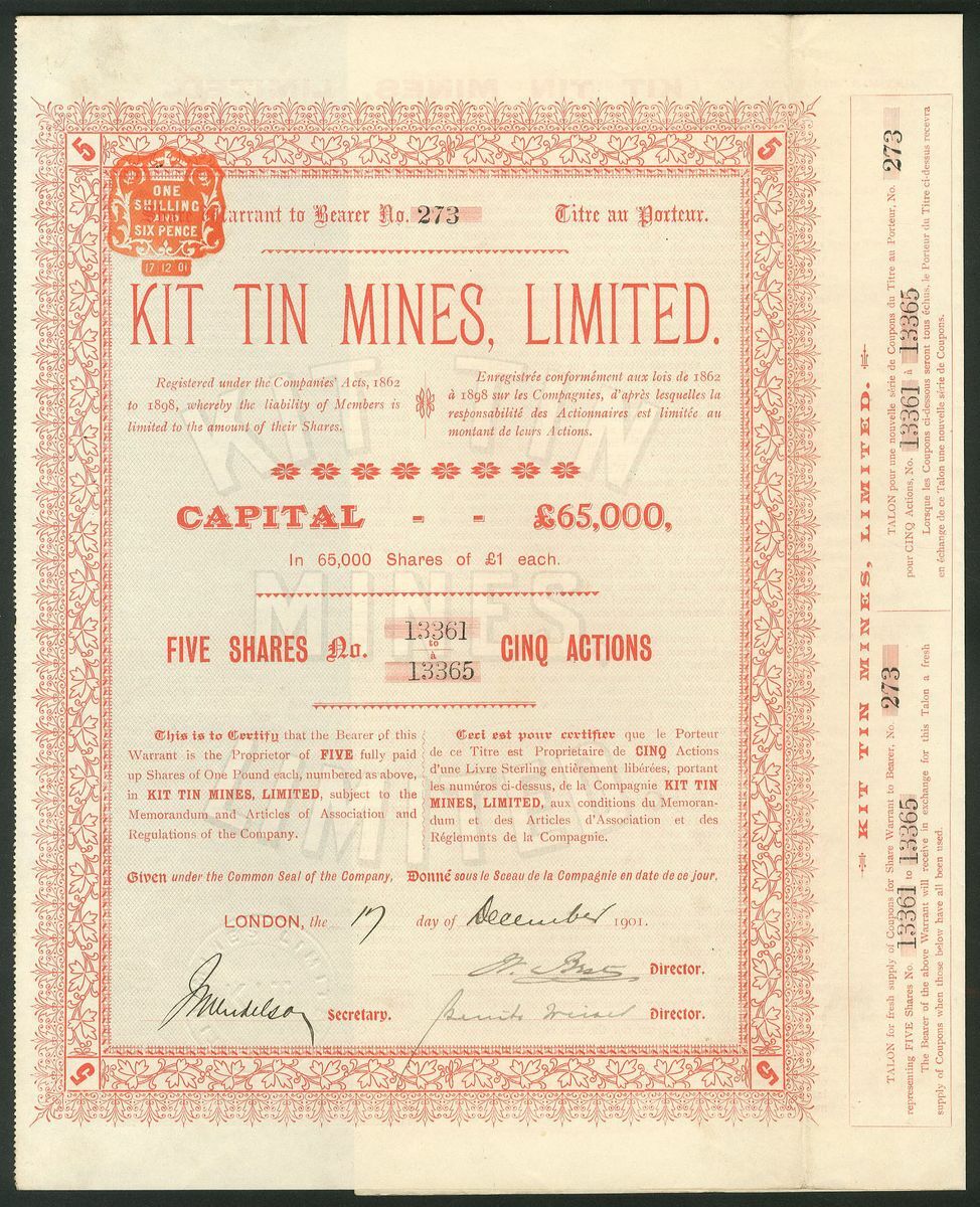 Great Britain: Kit Tin Mines Limited, 5 shares of £1, London 1901, #273, ornate border, red with blue underprint, text in English and French, with coupons. EF.