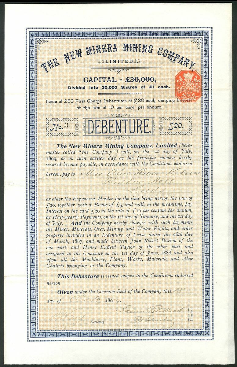 Great Britain: New Minera Mining Co. Ltd., £20 debenture, 189[4], #3, large 4 page format with decorative border, blue with buff underprint. Mines at Wrexham, North Wales. GVF.