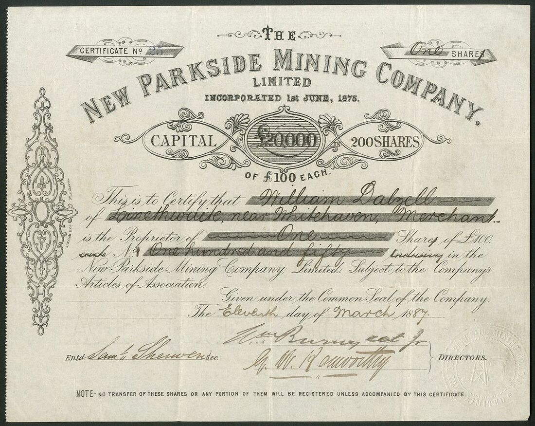 Great Britain: New Parkside Mining Co. Ltd., £100 share, 18[87], #25, decorative black printing. Iron Mining near Whitehaven, Cumberland. Slightly grubby in places, GVF.