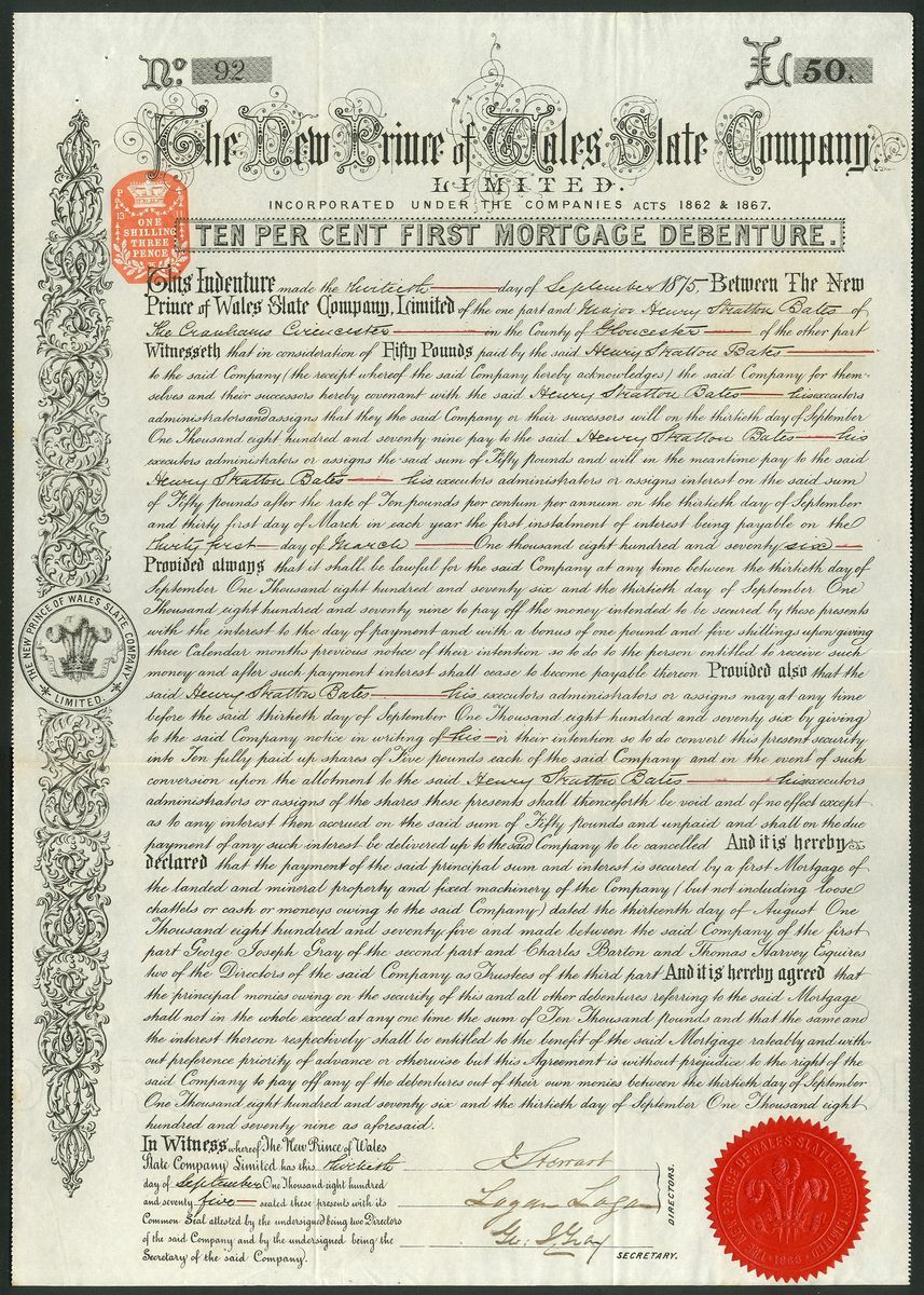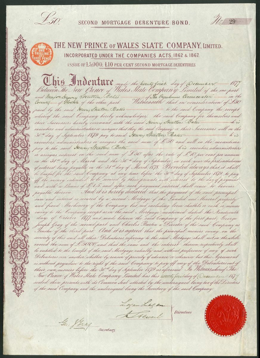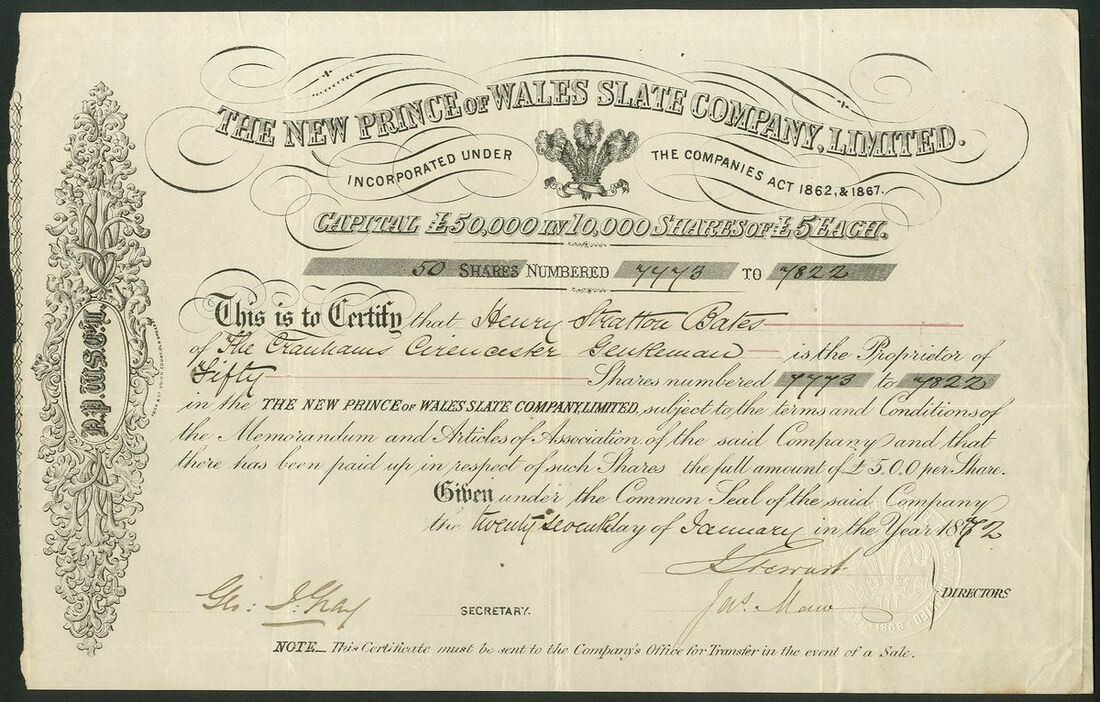 Great Britain: New Prince of Wales Slate Co. Ltd., a trio of certificates, £5 shares, 186[72], #7773-7822, black; 10% first mortgage debenture for £50, 1879, #92, black, and 2nd mortgage debenture bond for £50, 187[7], mauve. Owned quarries at Cwm Trwsowl and Bisen-y-Pennat in Carnarvonshire. Also built a tram line connecting the quarries to the port of Criccieth. All VF. (3)