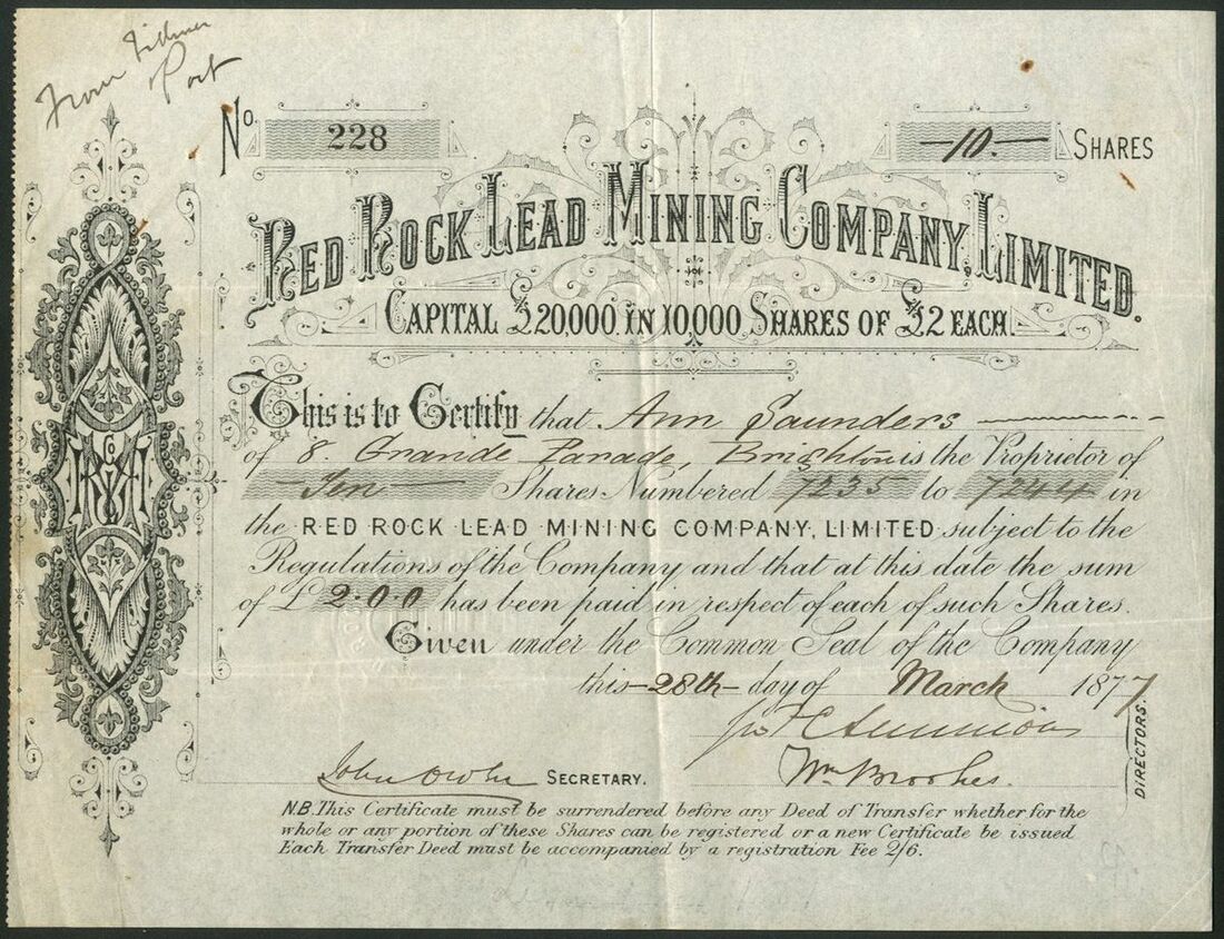 Great Britain: Red Rock Lead Mining Company Limited, £2 shares, 187[7], #228, black. Registered in 1876 to work the Graaggoch mine in the Lisburne Group, Cardiganshire. VF and rare.