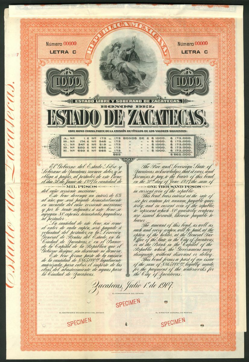 Mexico: Estado de Zacatecas, Specimen bond for $1000, 1907, 'letra C', Neptune reclining on rock at top, ornate border, orange and black, ABNCo., with coupons. No issued bonds of this small loan have been seen so far. VF and rare.