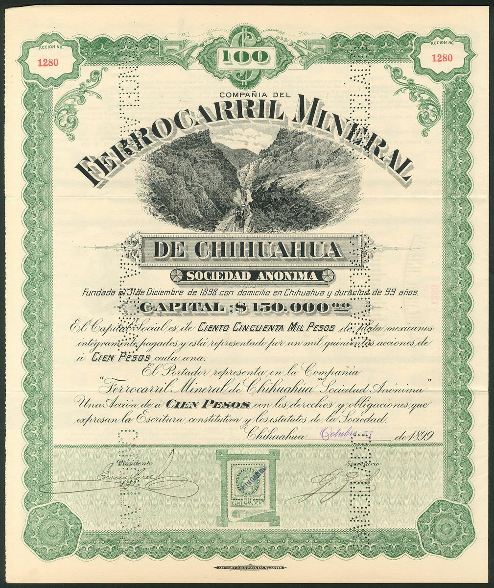 Mexico: Compañia del Ferrocarril Mineral de Chihuahua S.A., $100 peso share, #1280, Chihuahua 1899, vignette of steam train passing through canyon, green and black, with coupons, perforated