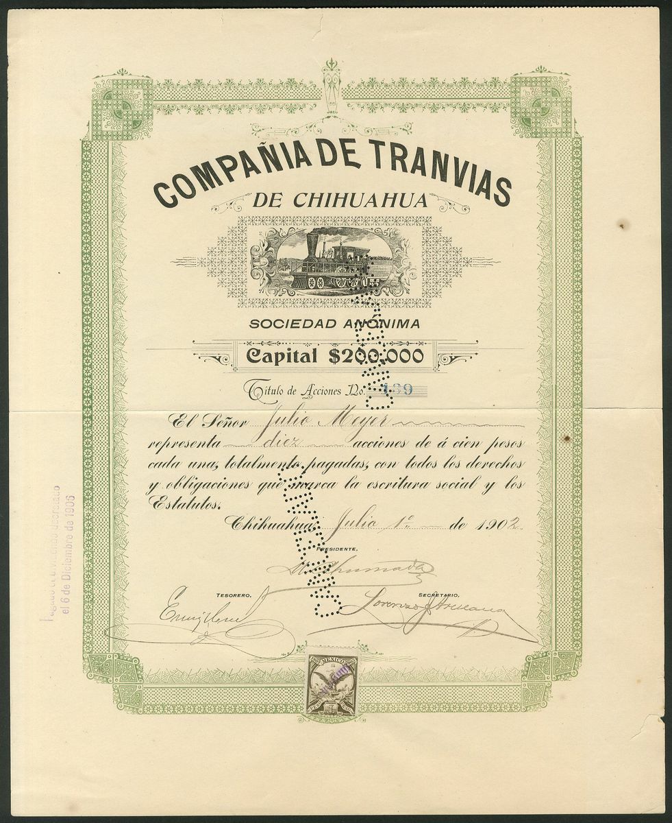 Mexico: Compañia de Tranvias de Chihuahua S.A., 100 peso shares, 190[2], #139, steam train in centre, green and black, perforated CANCELLED. Spilt at fold and small tear at right edge otherwise VF and scarce.